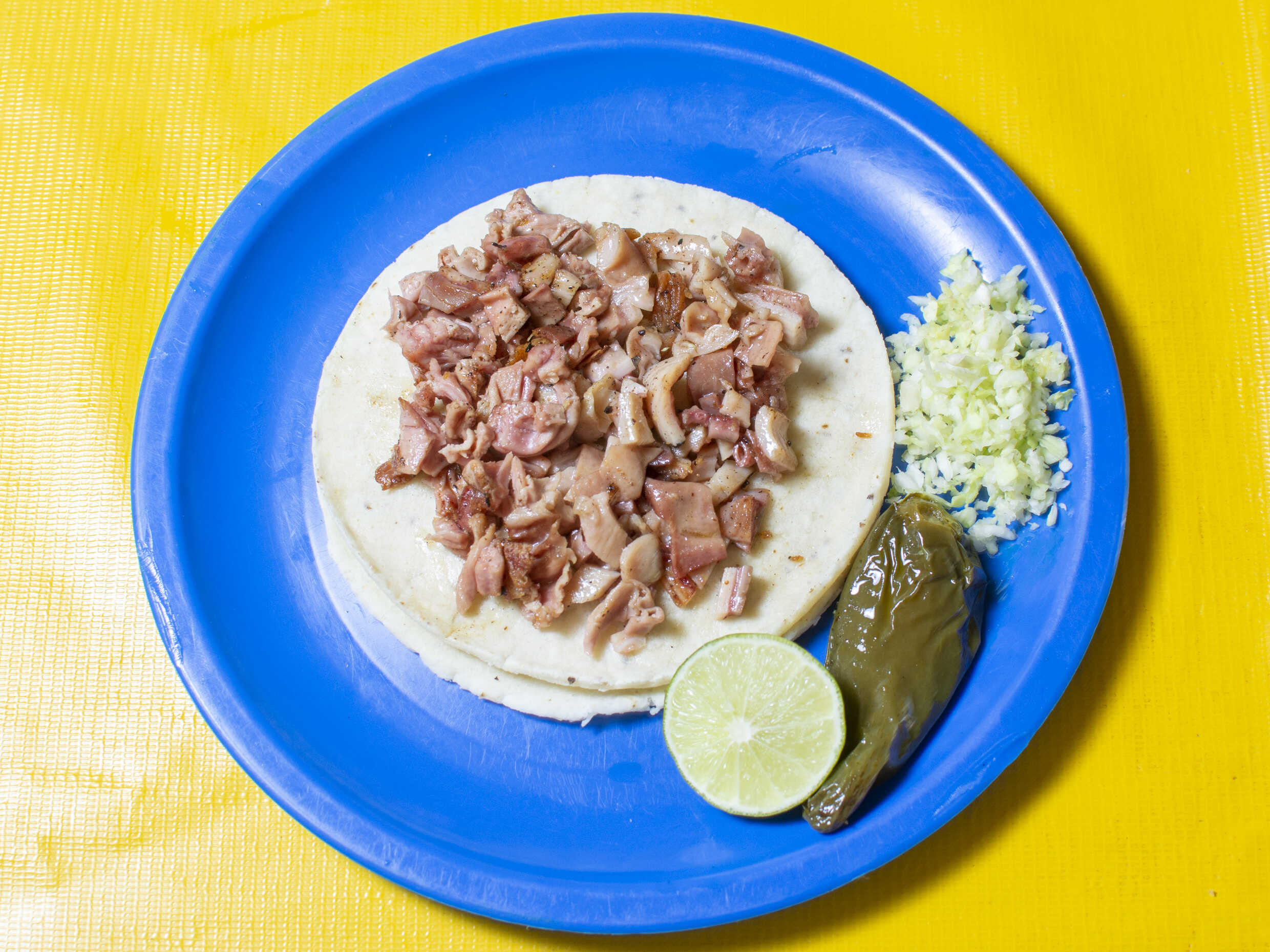 Tortilla de maiz blandita con panza de cerdo y tripa de cerdo, con repollo. Incluye salsa roja, aguacate, cebolla natural y cebolla curtida con habanero