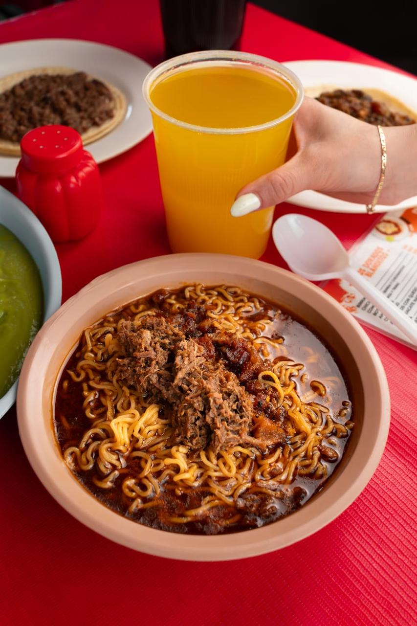 BIRRAMEN con caldo de res y una porción a elegir de birria o combinado con chicharrón (LA PORCIÓN EQUIVALE A LA CARNE DE UN TACO)