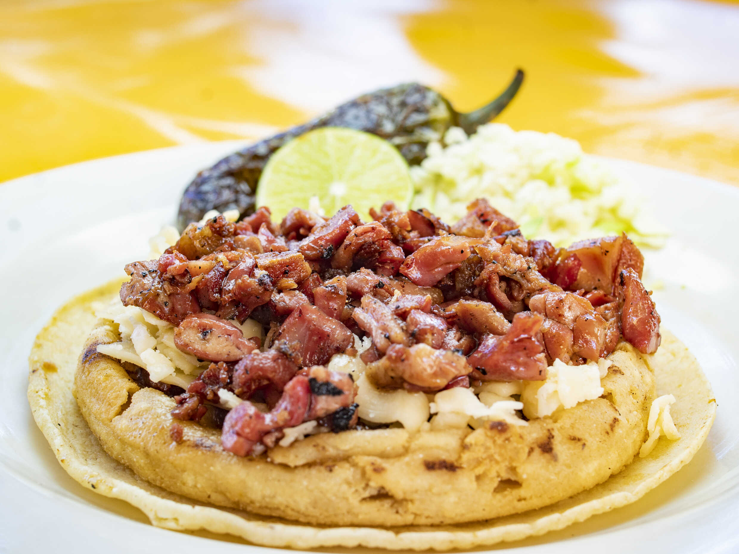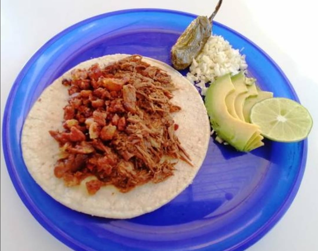Tortilla de maiz blandita con chicharrón de cerdo, con repollo. Incluye salsa roja, aguacate, cebolla natural y cebolla curtida con habanero