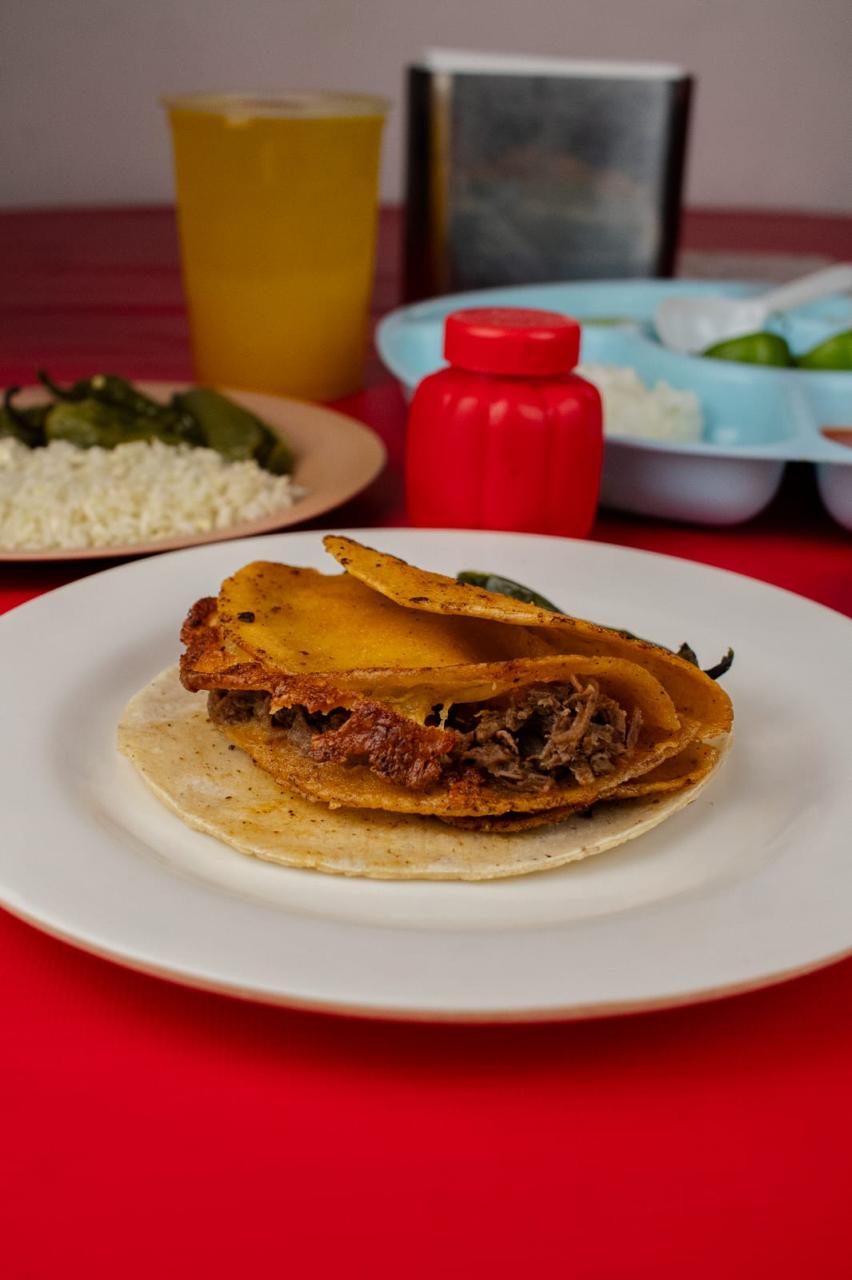 Tortilla de maiz blandita con birria de res y chicharrón, con repollo, con queso gratinado. Incluye salsa roja, aguacate, cebolla natural y cebolla curtida con habanero