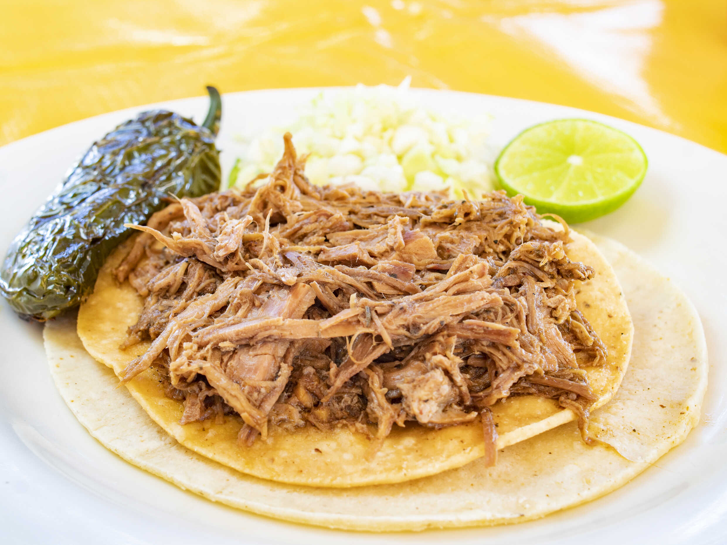 Tortilla de maiz blandita con panza de cerdo, con repollo. Incluye salsa roja, aguacate, cebolla natural y cebolla curtida con habanero