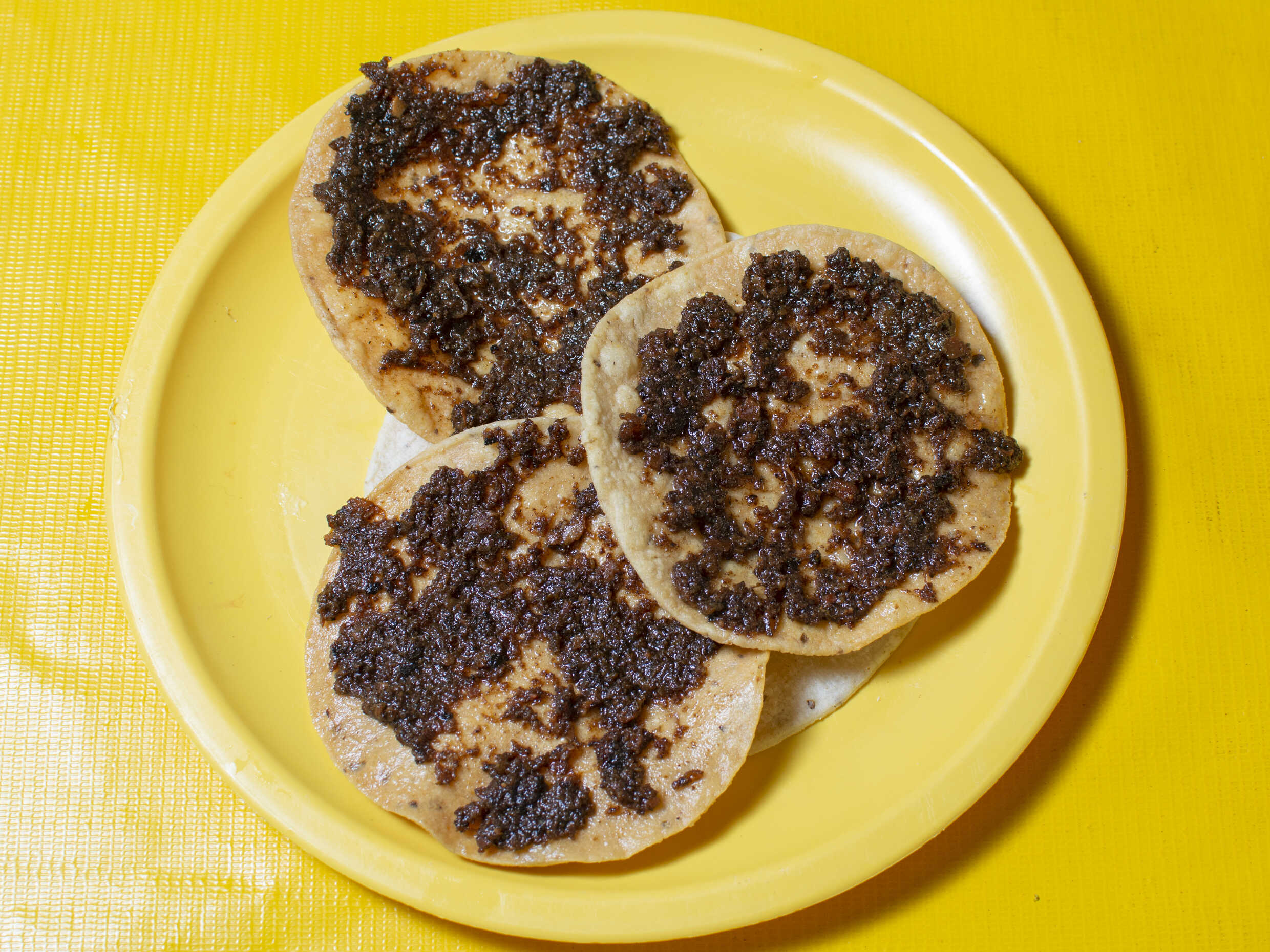 Tortilla de maiz Dorada con tripa de cerdo, con repollo. Incluye salsa roja, aguacate, cebolla natural y cebolla curtida con habanero