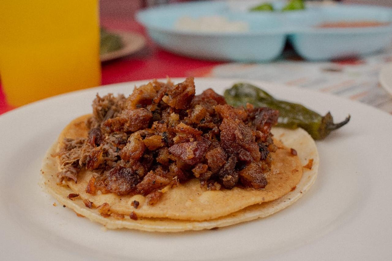 Tortilla de maiz Dorada con panza de cerdo, con repollo. Incluye salsa roja, aguacate, cebolla natural y cebolla curtida con habanero