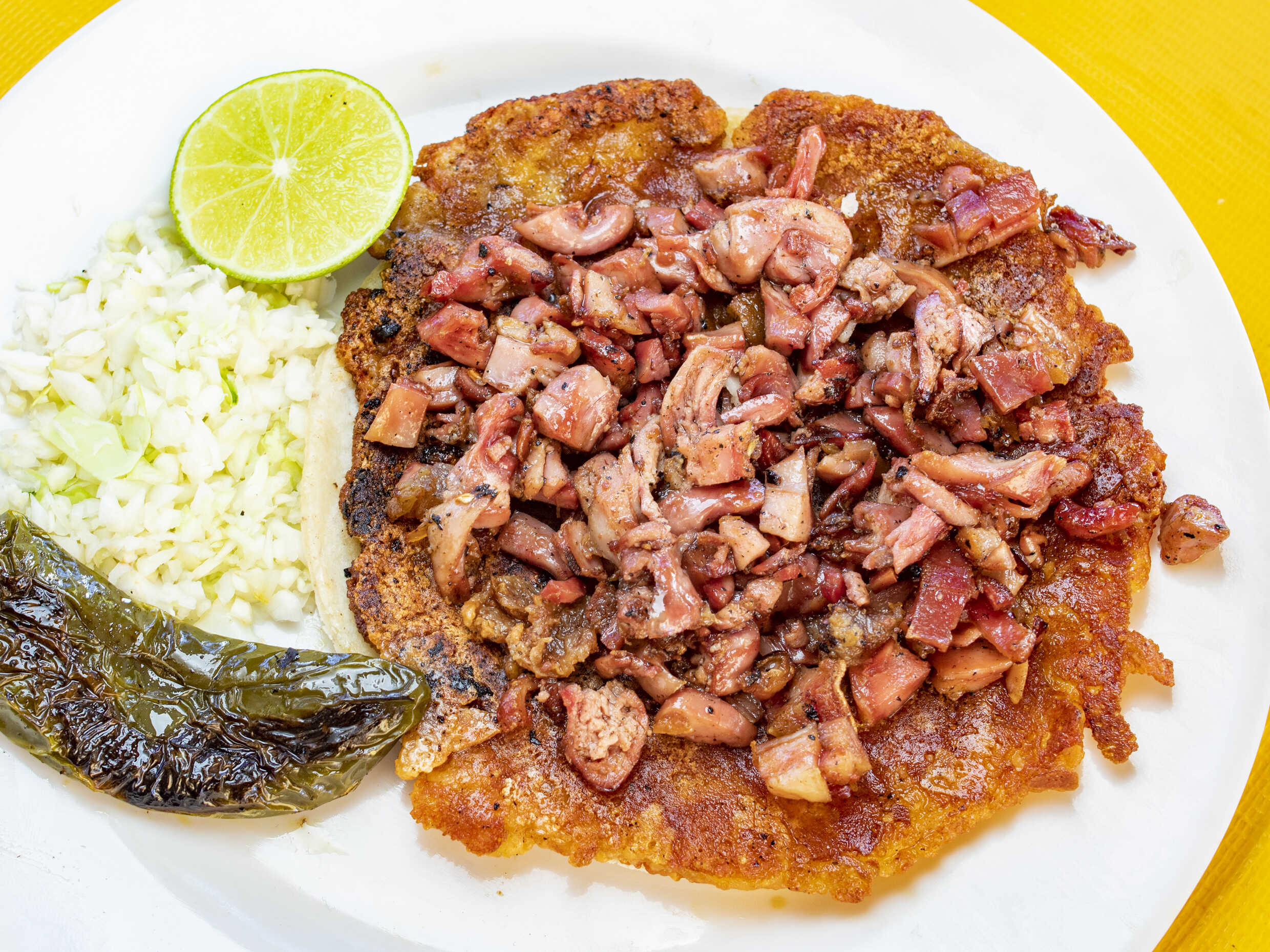 Tortilla de maiz Dorada con panza de cerdo y tripa de cerdo, con repollo. Incluye salsa roja, aguacate, cebolla natural y cebolla curtida con habanero