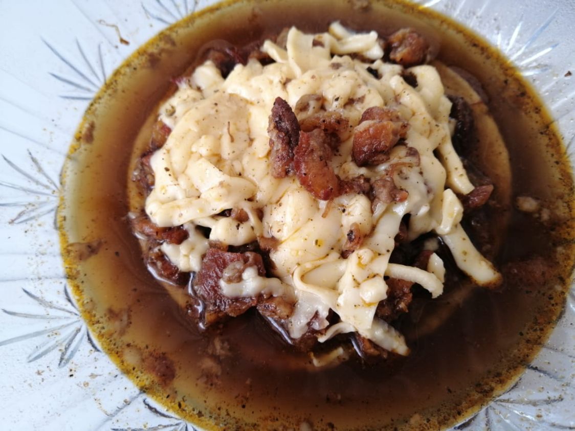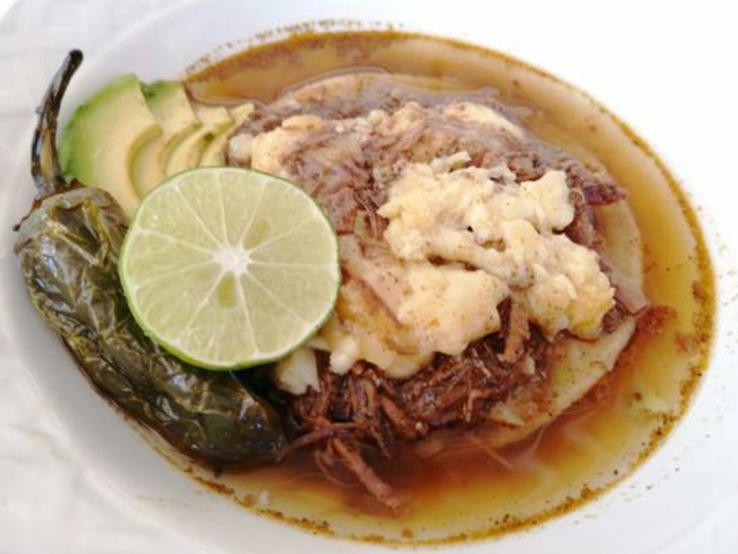 Tortilla de maiz dorada con birria de res y chicharrón, con repollo, con queso gratinado, ahogado en caldo de birria. Incluye salsa roja, aguacate, cebolla natural y cebolla curtida con habanero