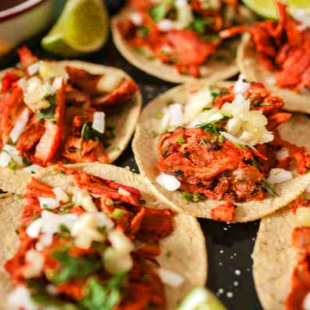 tacos de maiz, carne adobada al carbon, acompañados de verdurita y salsas