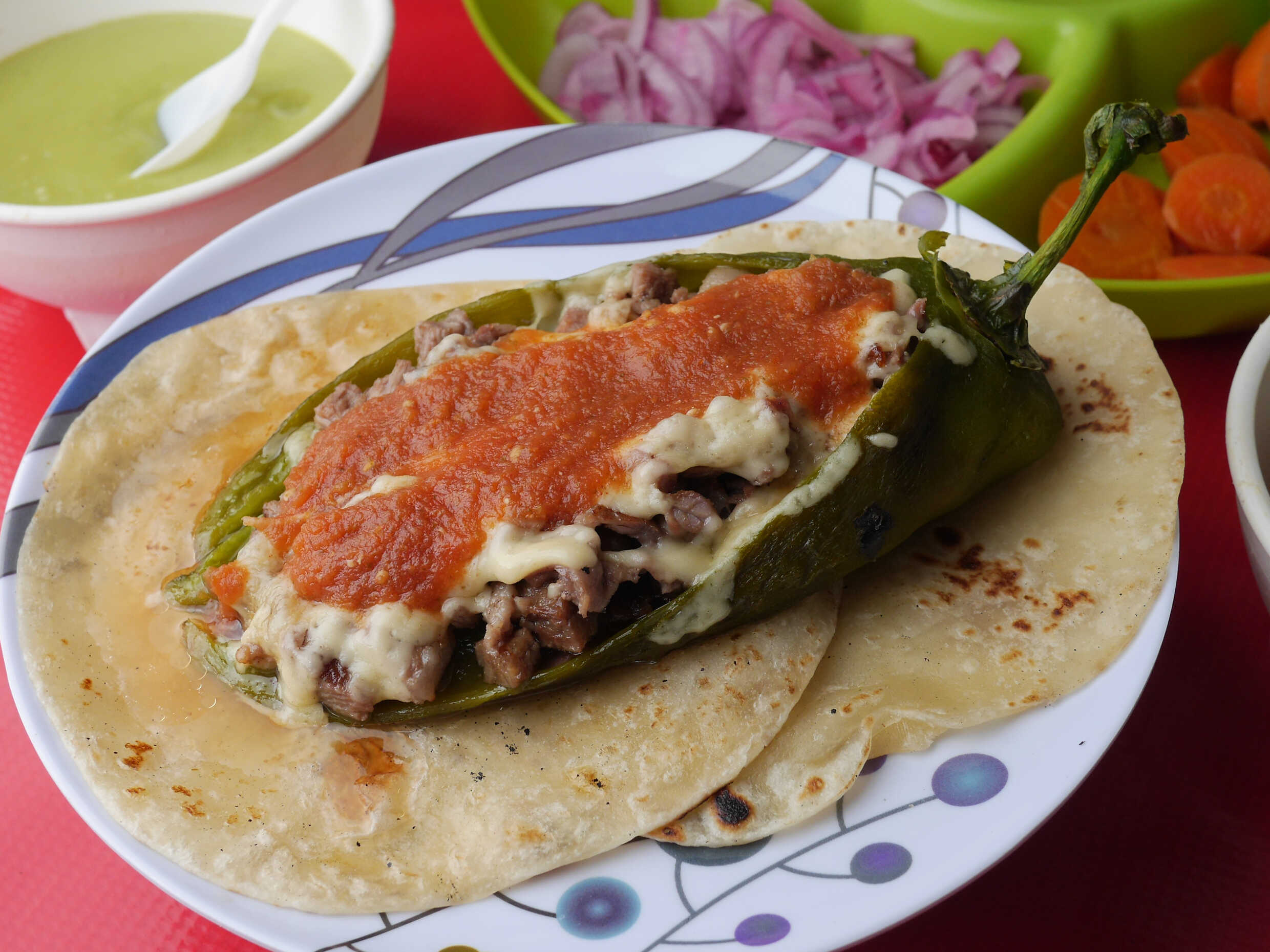 Chile verde relleno de carne asada, queso y jugo de tomate y dos tortillas.