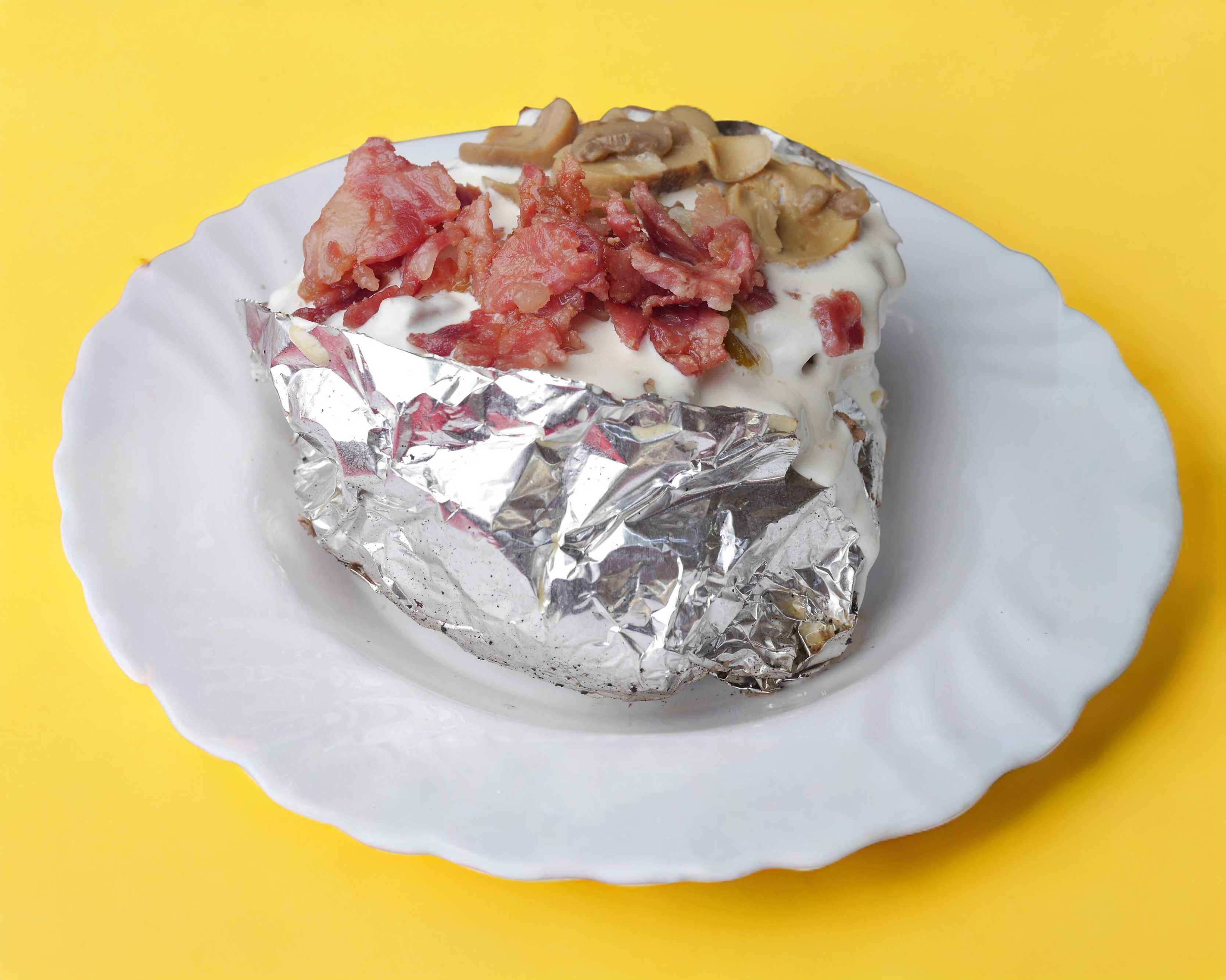 Papa rellena de carne asada, mantequilla, queso, media crema, tocino y champiñones. Acompañado de 5 tortillas, frijoles charros y cebolla asada.