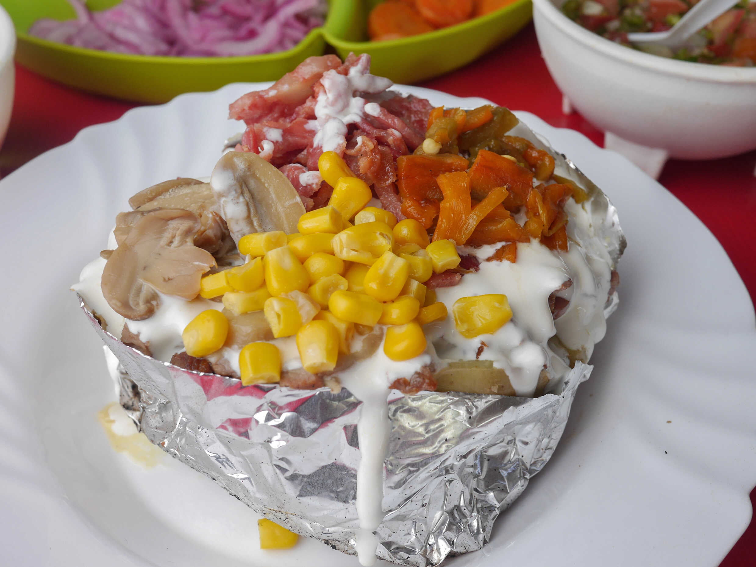 Papa rellena de carne, mantequilla, queso, media crema, tocino, champiñon, elotes y chile en rajas. Acompañado de 5 tortillas y frijoles charros