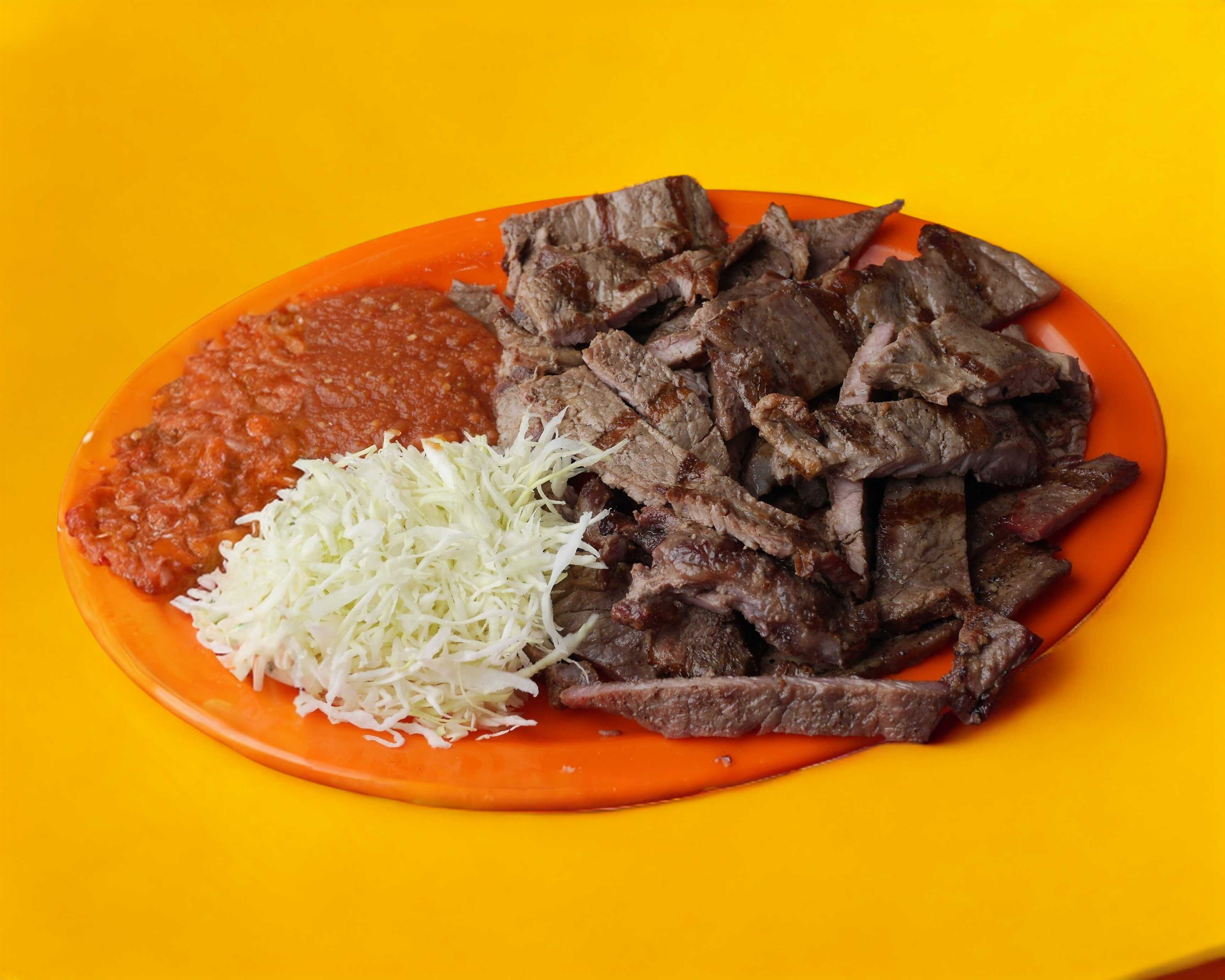 Orden de carne asada (en tiras), 10 tortillas, medio litro de frijoles charros, repollo, jugo de tomate y verdura.