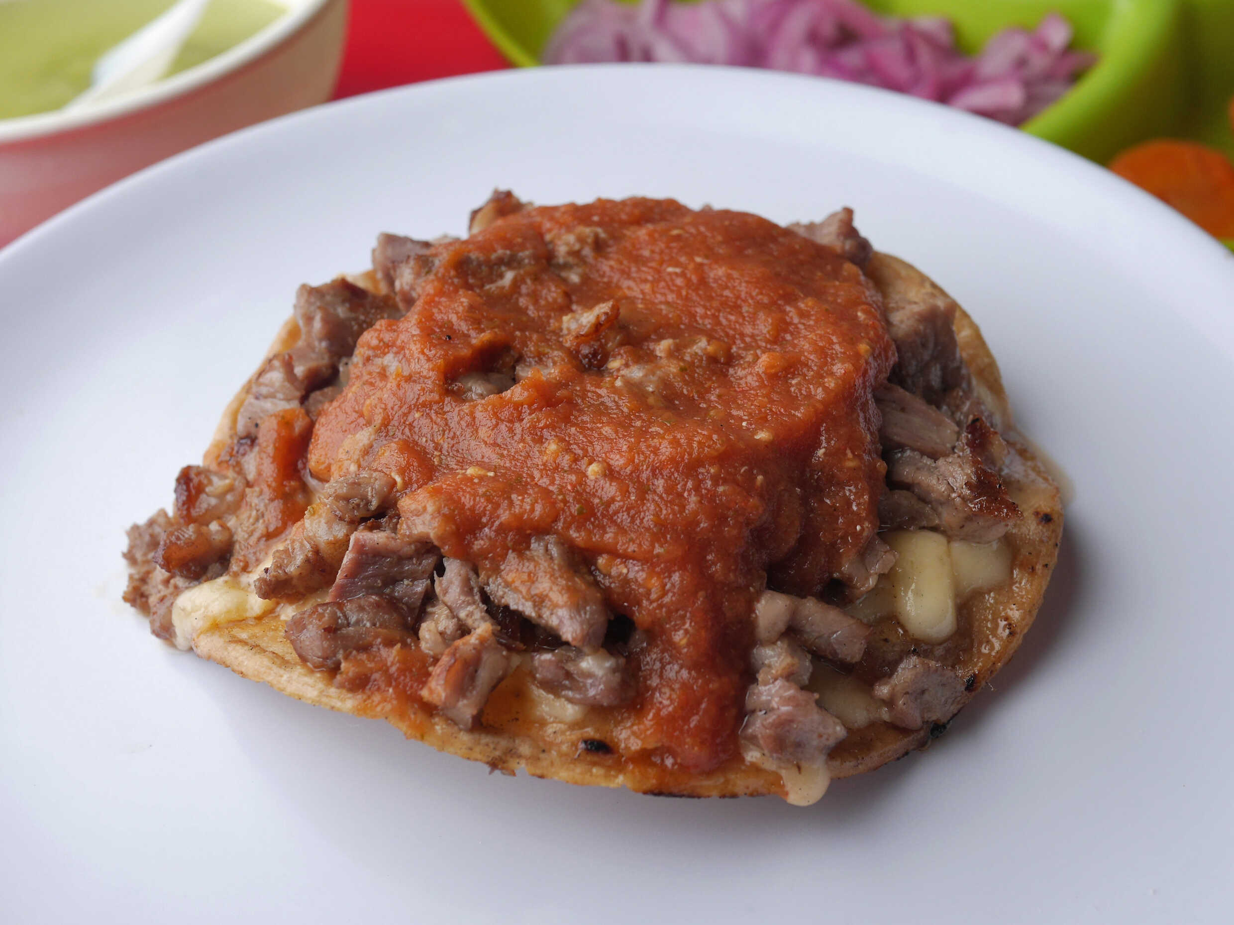 Tortilla dorada de maíz con queso, carne y jugo tomate.