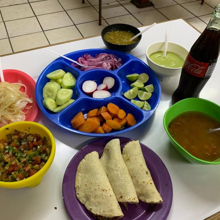 3 TACOS DE CARNE ASADA, REFRESCO (COCA 450 ML), FRIJOLES CHARROS Y CEBOLLA ASADA