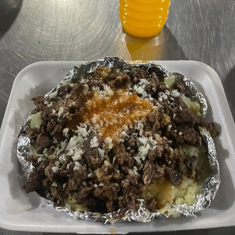 papa, mantequilla, queso, carne de res