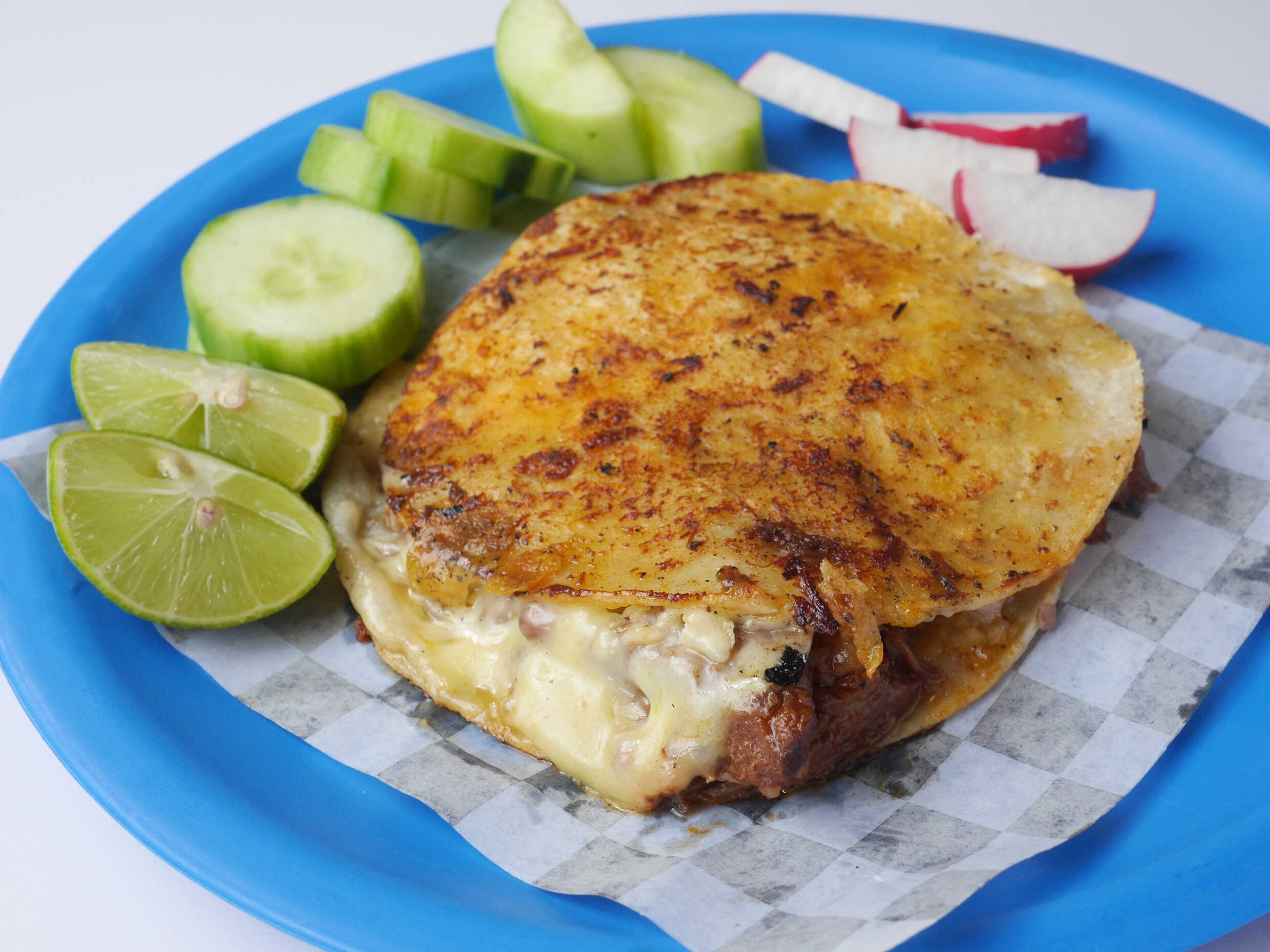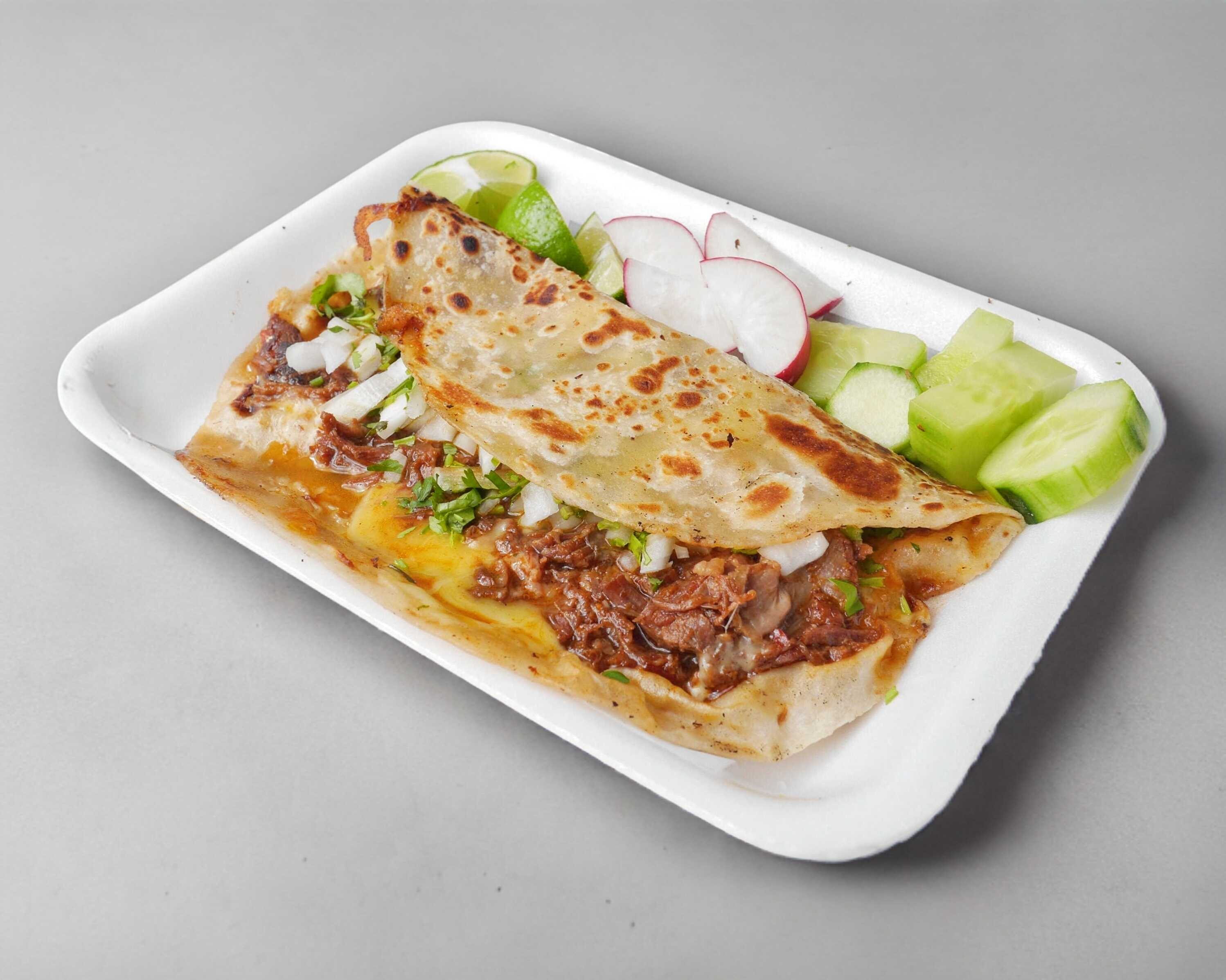 Quesadilla de birria tortilla de maíz acompañado de cebolla, cilantro, limón, rábano, pepino y salsa.