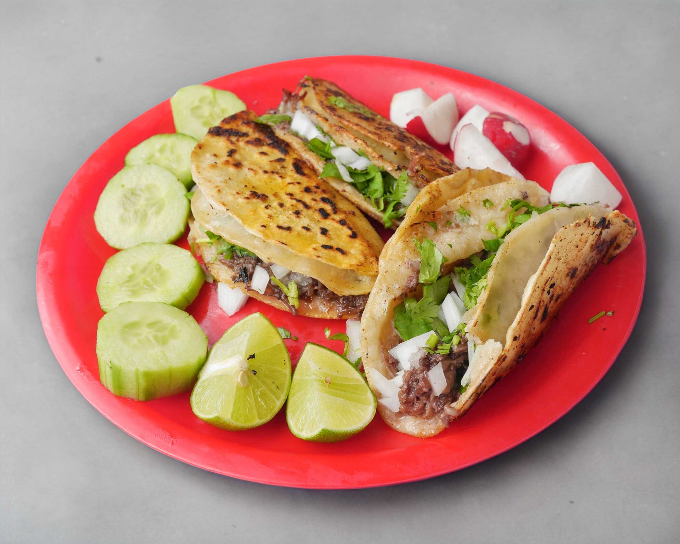 Con queso gratinado orden de 2 tacos con el guiso a elegir, acompañado de cebolla, cilantro, pepino, rábano, limón y salsa.