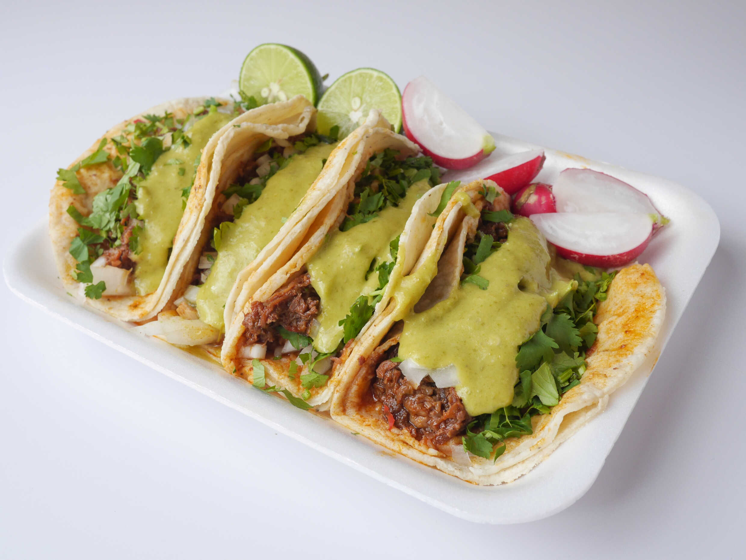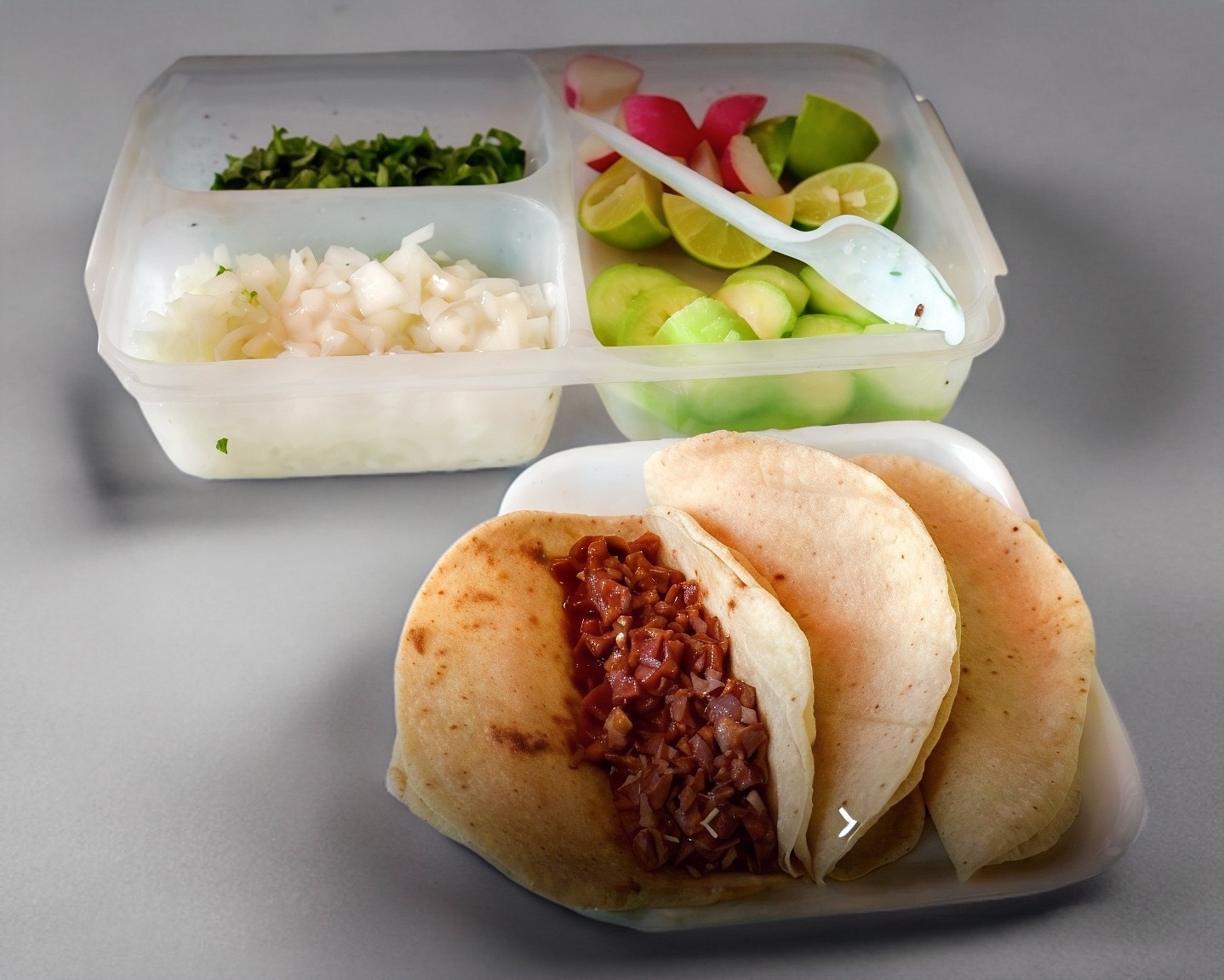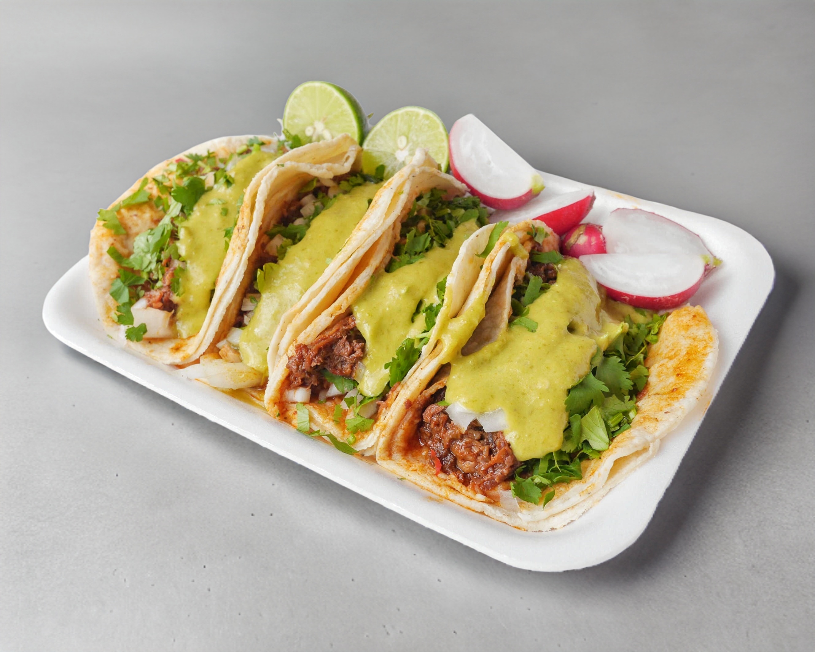3 Tacos de tortilla de maíz con el guiso a elegir acompañado de cebolla, cilantro, pepino, rábano, limón y salsa. Con refresco 355ml.