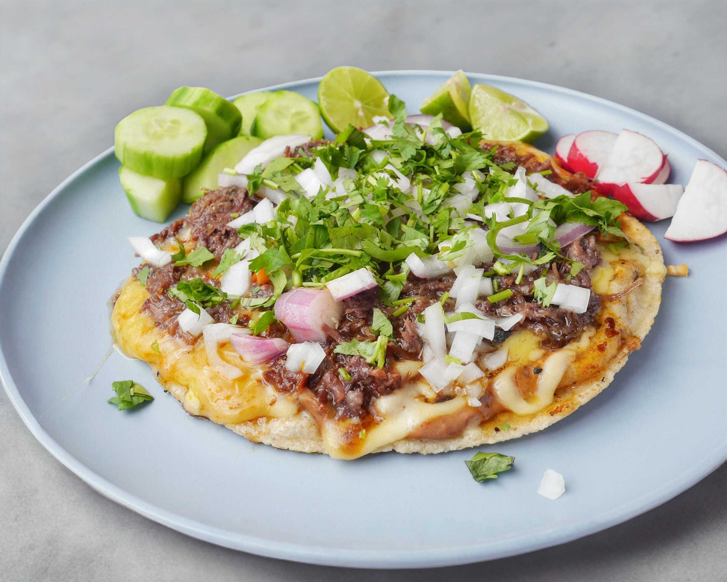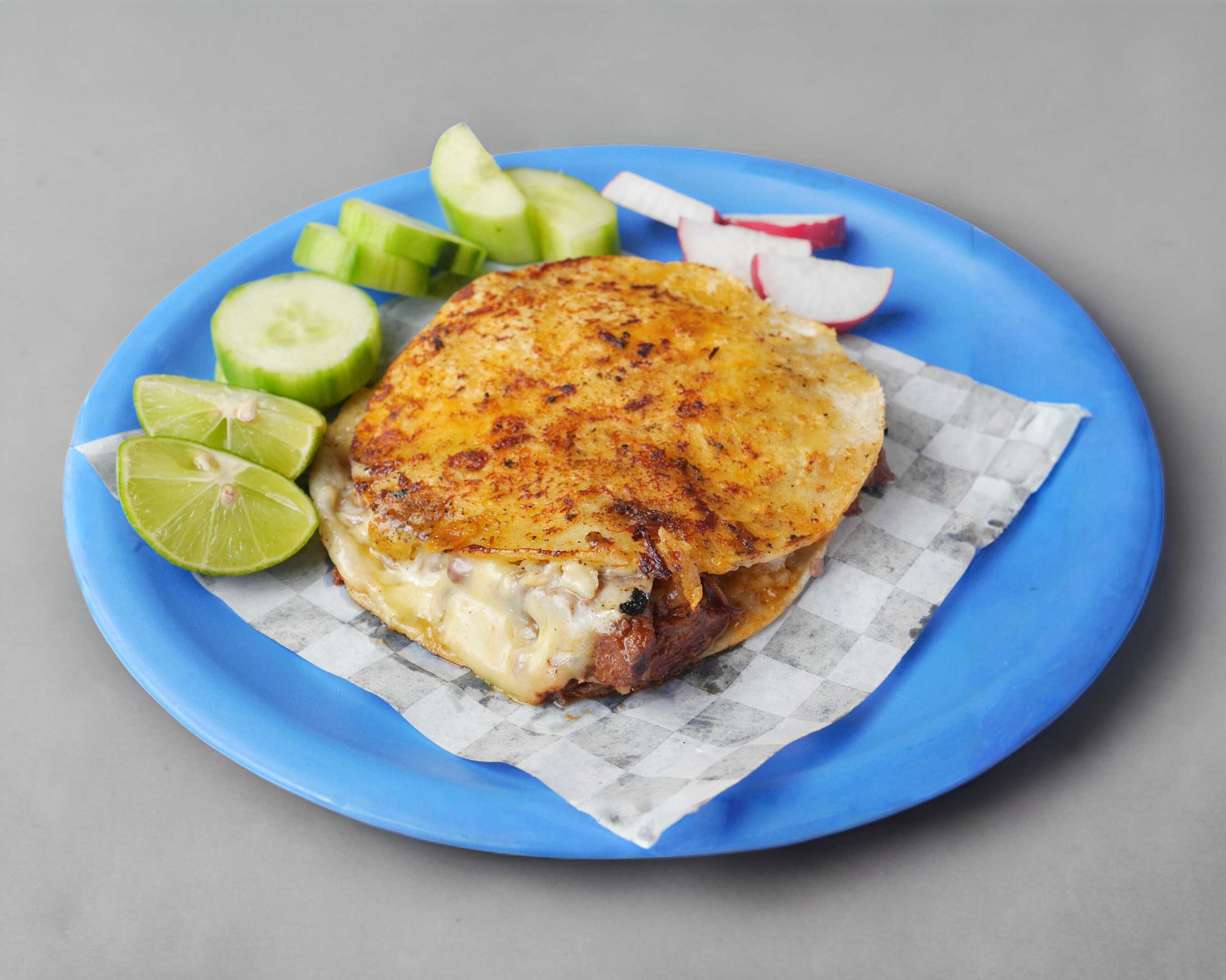 Es una tortilla super grande gruesa de maíz, lleva frijol aciento, queso chihuahua y el guiso de su preferencia.