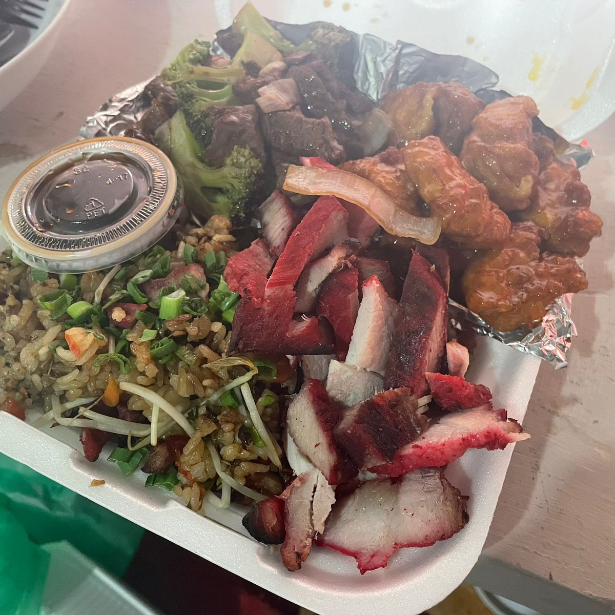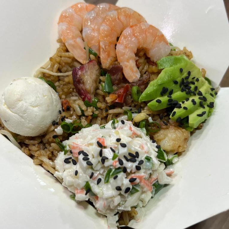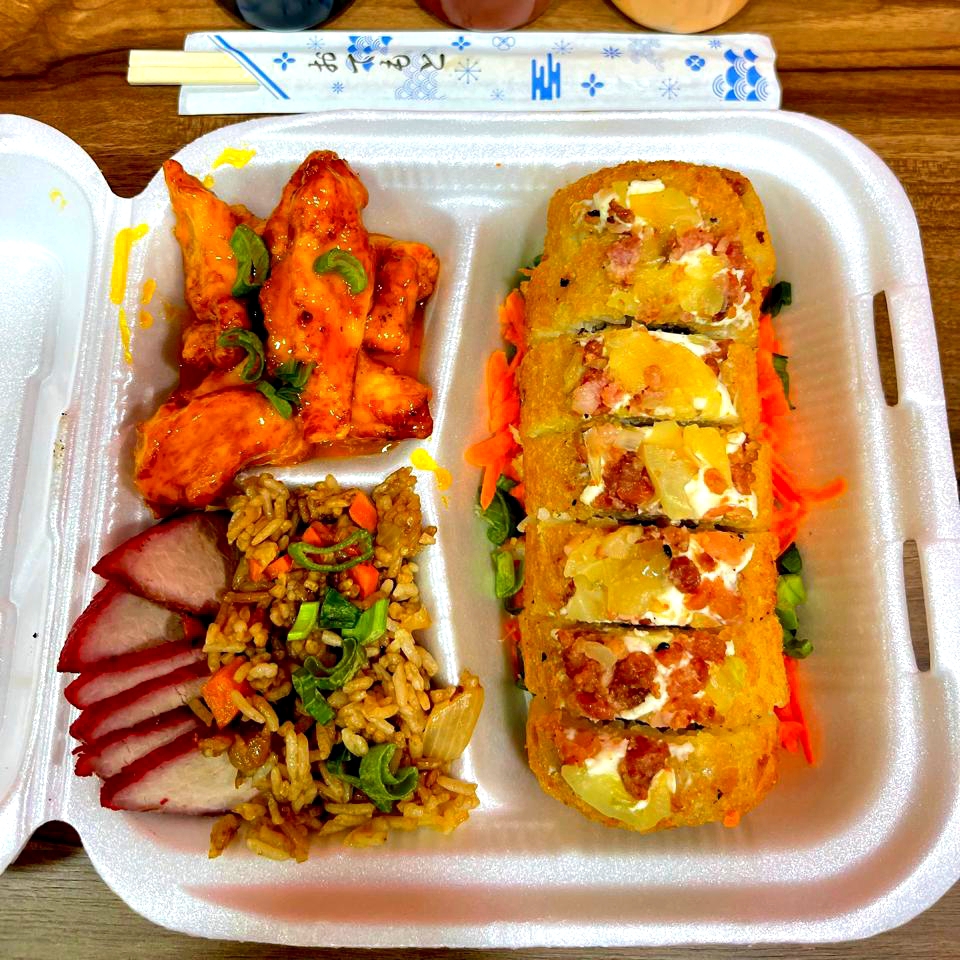 Arroz Grande + 2 guisos + 1 rollo California + 2 rollos primavera.