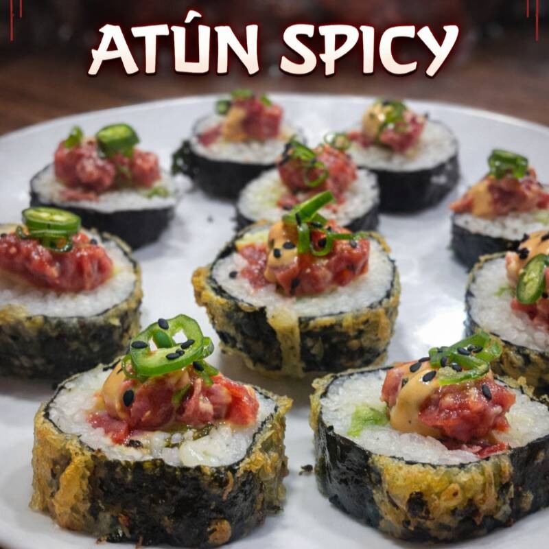 Philadelphia, aguacate, pepino, atún, coronado con láminas de atún y aderezo spicy
