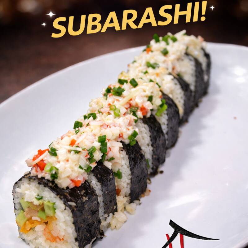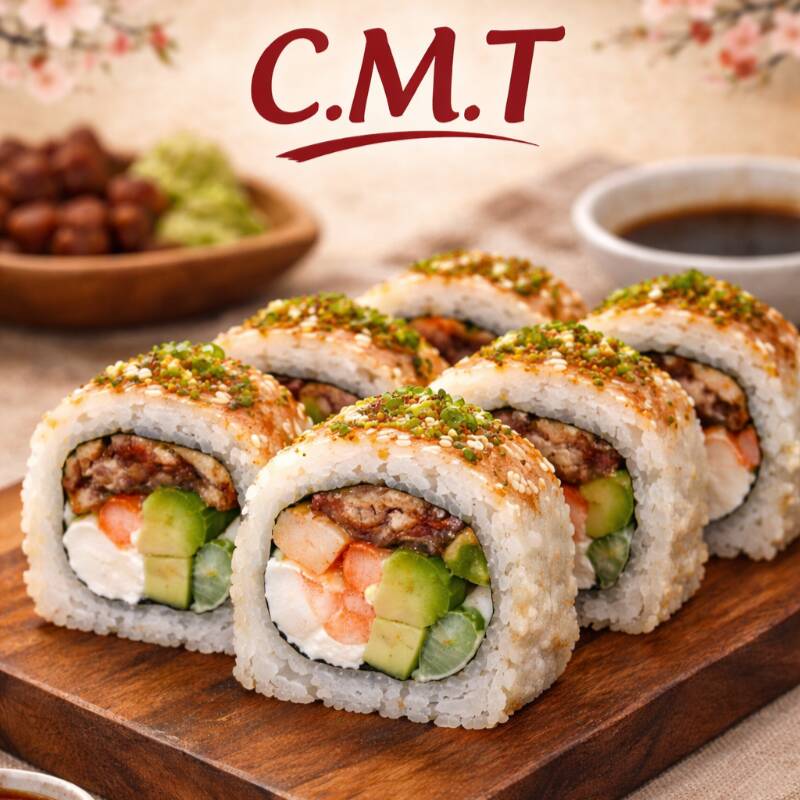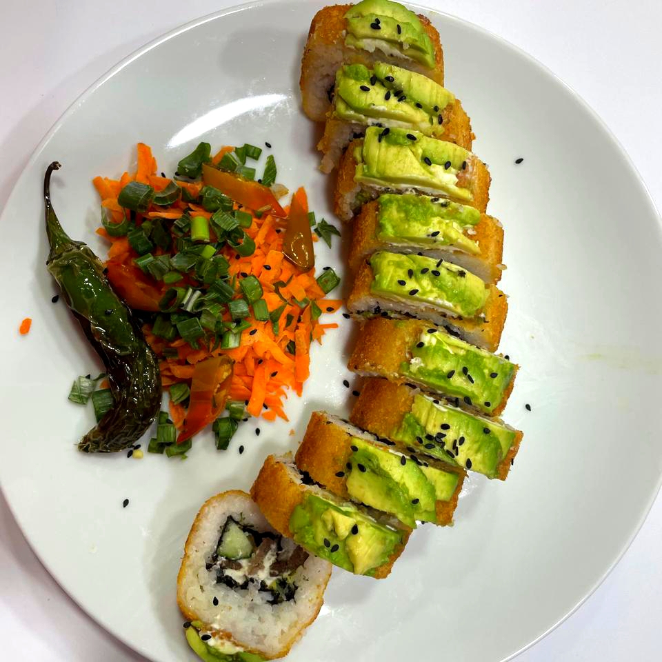 Philadelphia, aguacate, pepino, camarón coronado con tampico