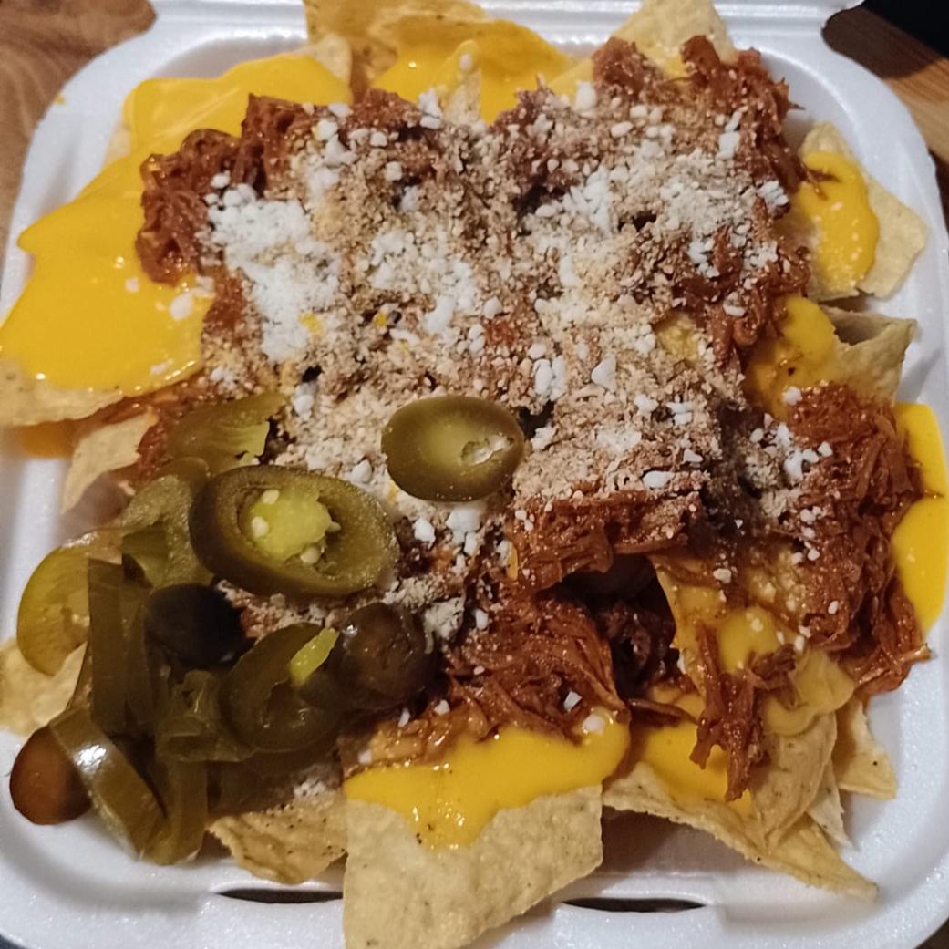 orden de nachos con carne de cerdo, queso cheddar, queso blanco y jalapeños