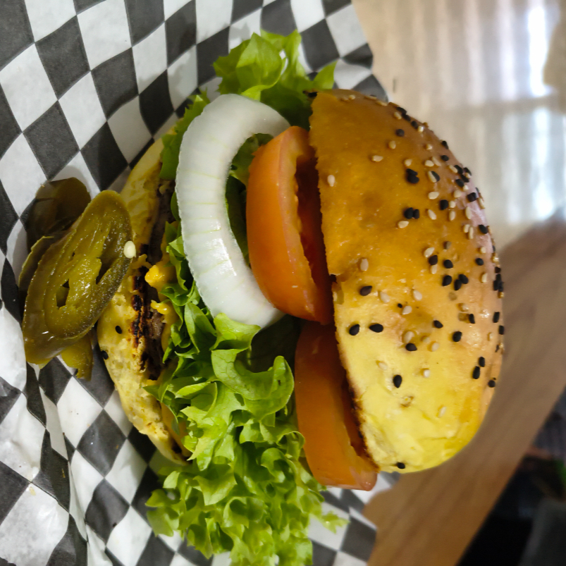 pan, doble carne, doble queso amarillo, lechuga, tomate y cebolla