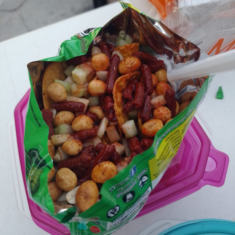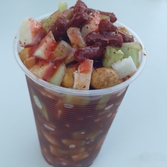 tostitos con cacahuate, rielito, pepino, clamato y salseado