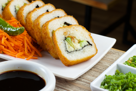 Arroz empanizado con res, pollo, tocino, camarón y surimi acompañado con aguacate, philadelphia y tampico.