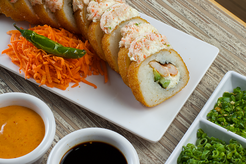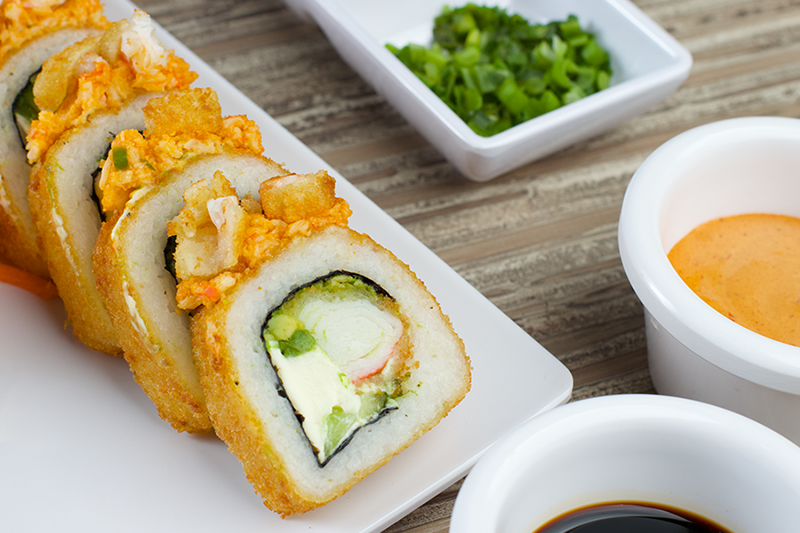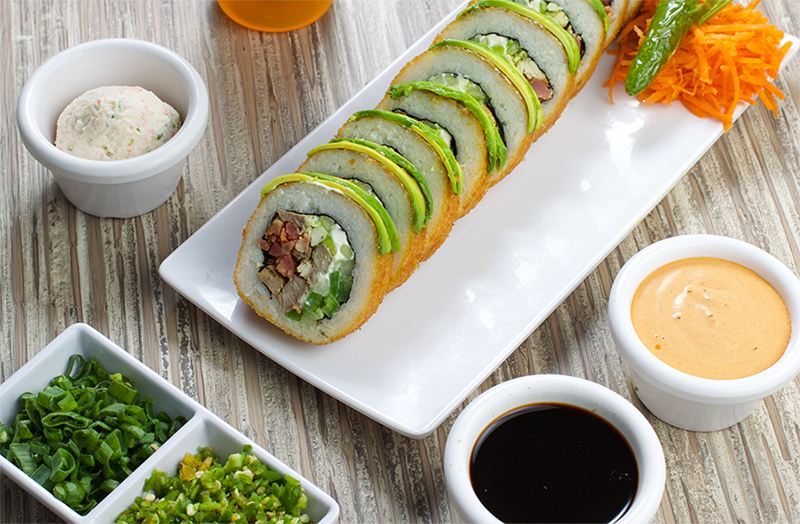 Arroz empanizado con res, pollo, tocino, camarón y surimi acompañado con aguacate, philadelphia y tampico.
