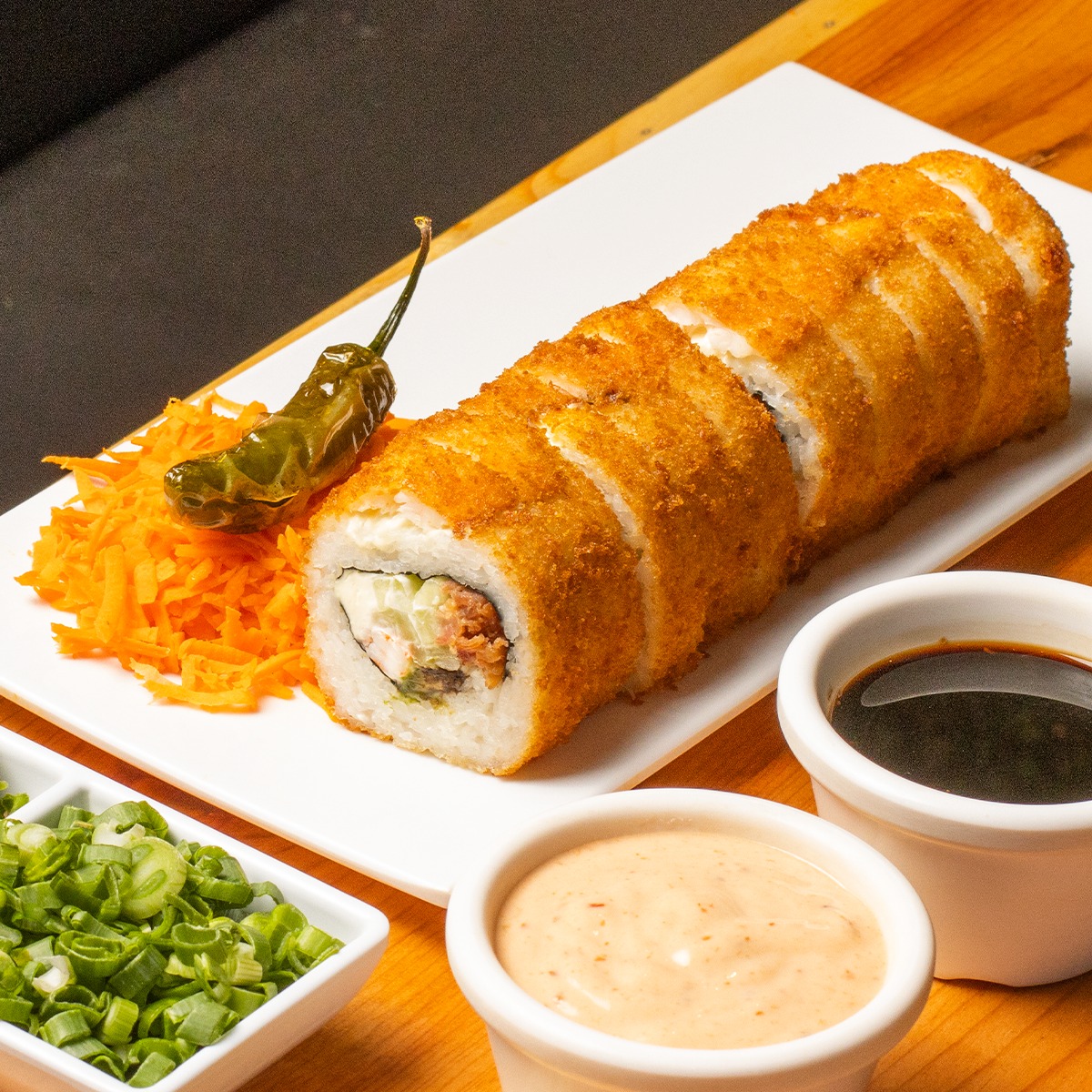 Pepino, aguacate, queso philadelphia, carne de res, tocino, chile verde, chile caribe. Por fuera queso gratinado y camarón empanizado.