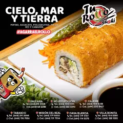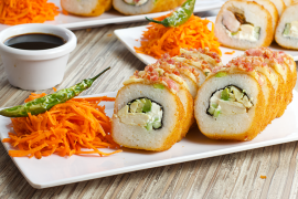 Arroz empanizado con res, pollo, tocino, camarón y surimi acompañado con aguacate, philadelphia y tampico.