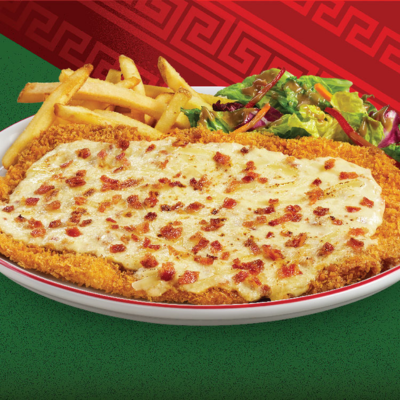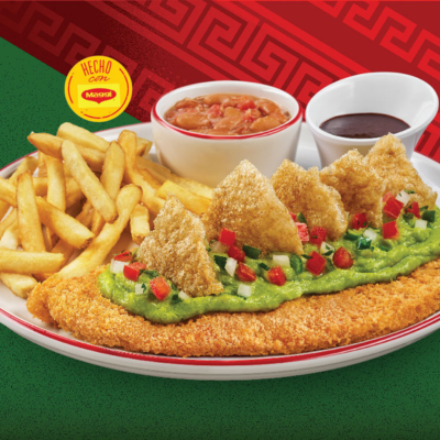 Pechuga de pollo empanizada (150 g) con papas a la francesa y guacamole.