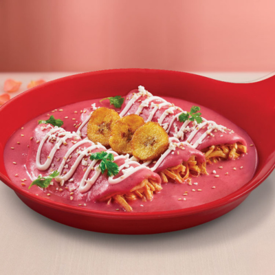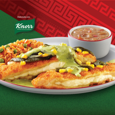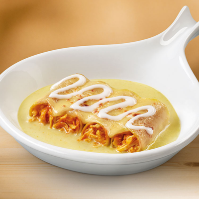 Rellenas de pollo guisado, con nuestra tradicional salsa suiza, gratinadas con queso gouda, cebolla y acompañadas de frijoles refritos.