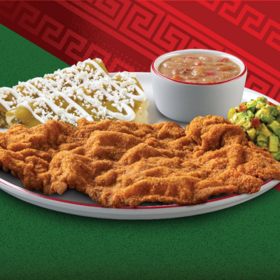 Milanesa de pollo (160 g), acompañada de frijoles y dos huarachitos con salsa, uno verde y uno rojo.