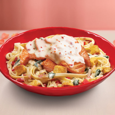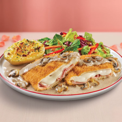 Lechuga italiana, pechuga marinada a la parrilla (150 g), durazno, fresas, queso panela (80 g) adornada con nuez picada y vinagreta de naranja. Acompañada con pan de ajo.