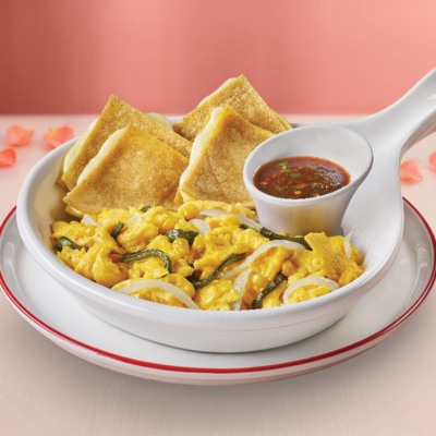 Deliciosos huevos revueltos con crujiente tocino, acompañados de frijoles refritos, totopos y chapata, con salsa picante.