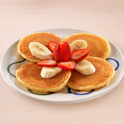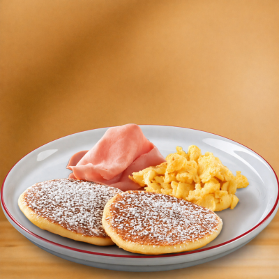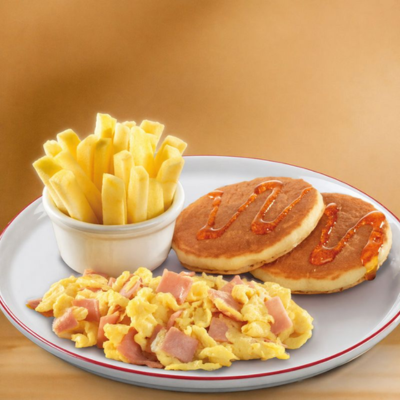 Huevo revuelto con jamón, acompañado de 2 piezas de hot cakes glaseados. ¡Incluye Sorpresa!