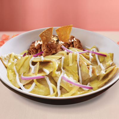 Chilaquiles verdes, con queso, crema y chorizo acompañados de tiras de pollo asadas (160 g) y un huevo estrellado.