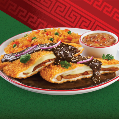 Con arroz a la mexicana, pollo, aguacate, queso oaxaca y chipotle.