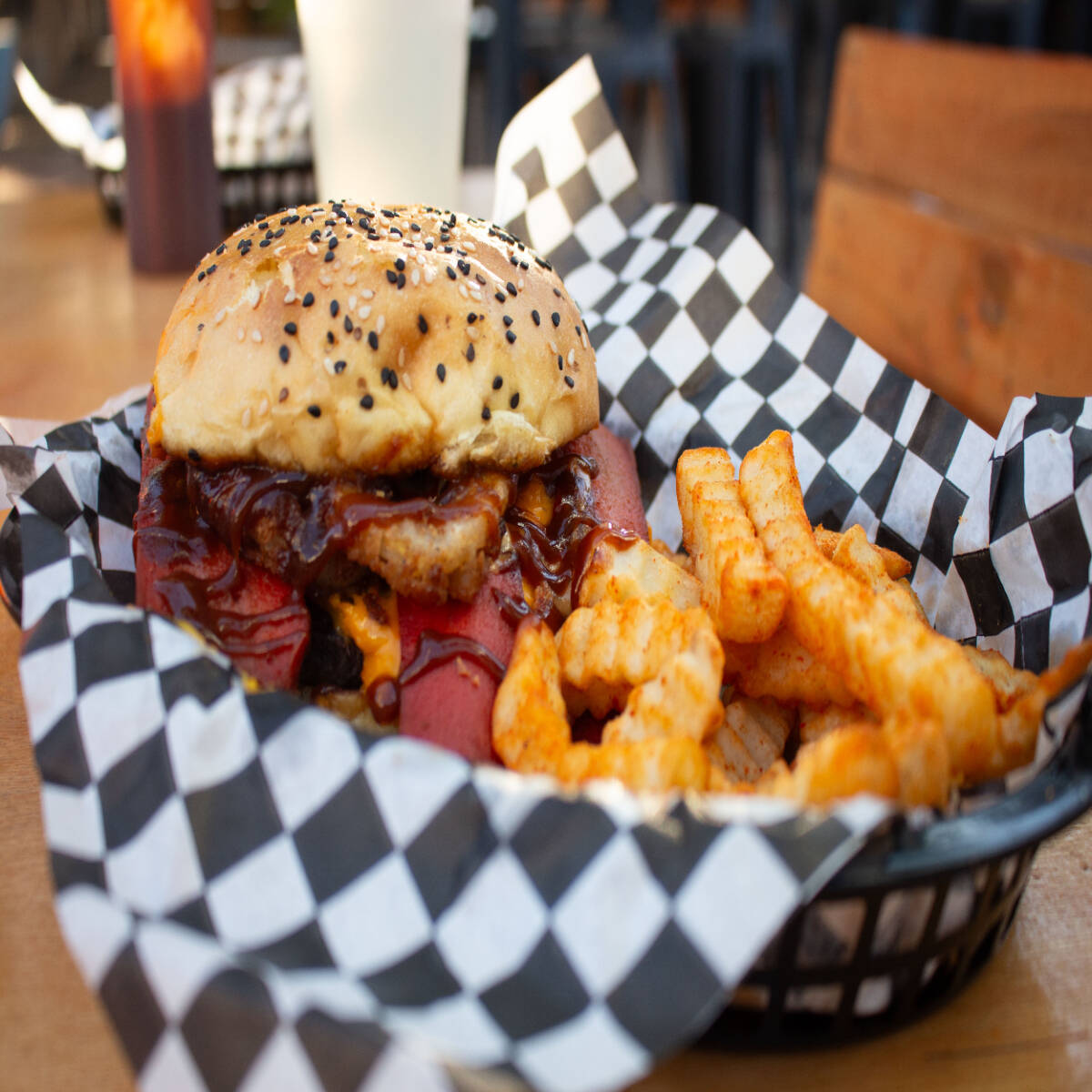Hamburguesa con carne de res, aros de cebolla, salchicha para asar campestre, queso chihuahua. todo bañada en salsa BBQ