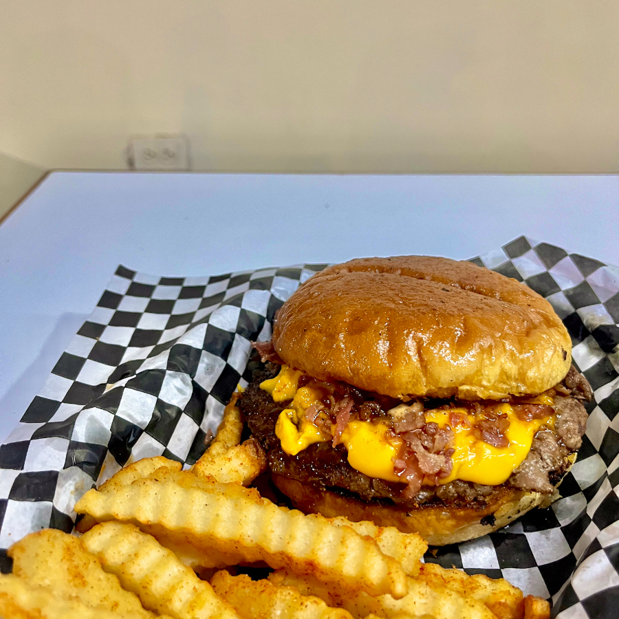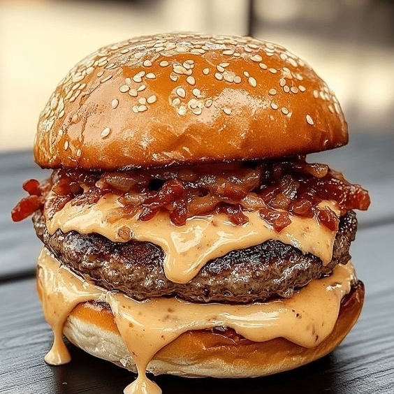 Hamburguesa con carne de res, queso cheddar, cebolla asada, mermelada de tocino y aderezo especial Wayhot