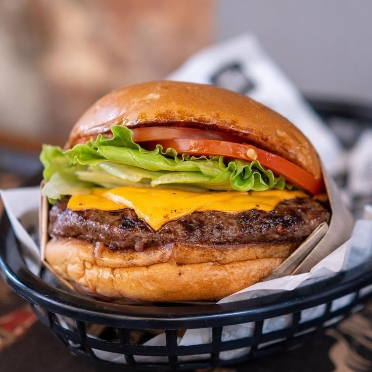 Hamburguesa sencilla de carne de res , acompañada de queso amarillo, tomate bola, lechuga fresca y cebolla fresca