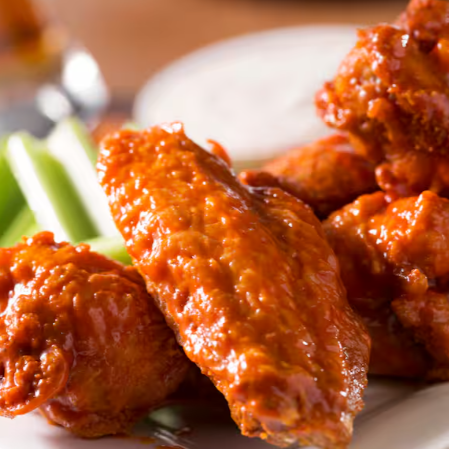 Alitas de Pollo en marinado de la casa con su exclusiva receta secreta para combinar excelente con salsas y aderezos. El platillo está acompañado con porción de Aderezo Ranch, Apio y Zanahoria