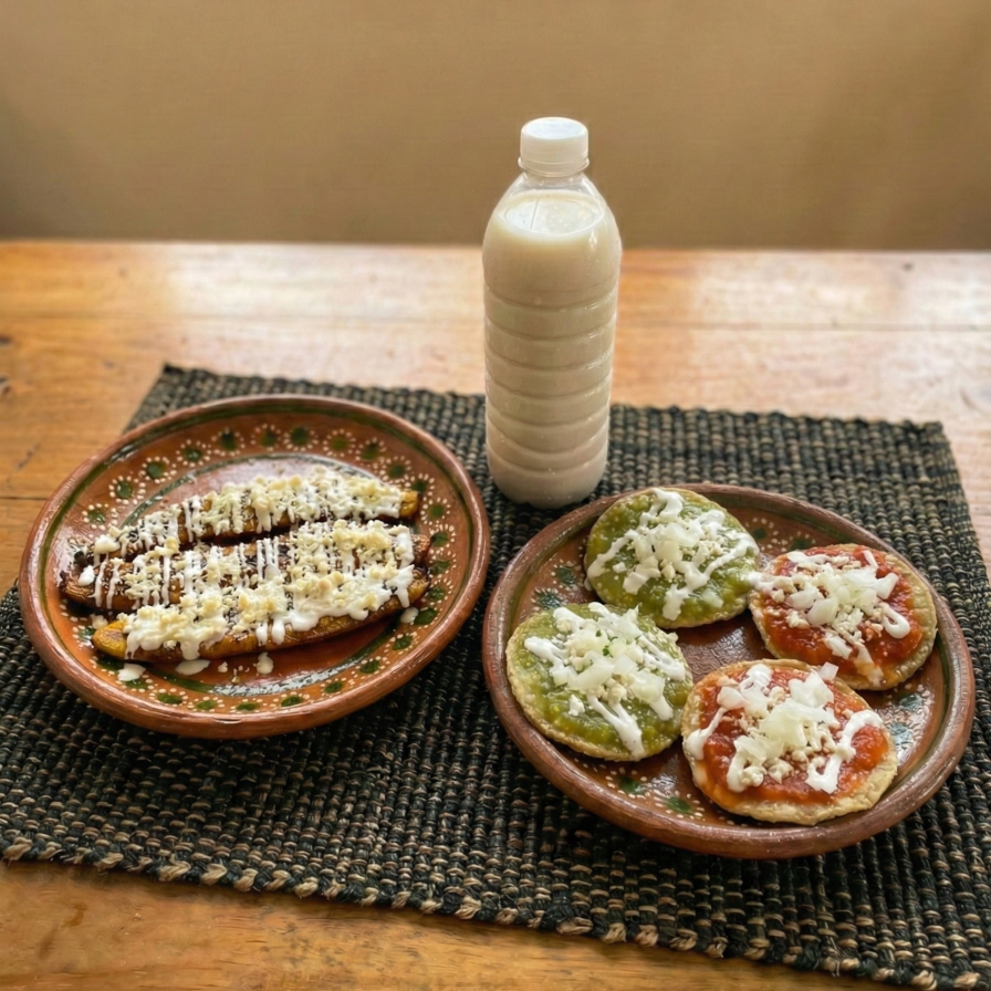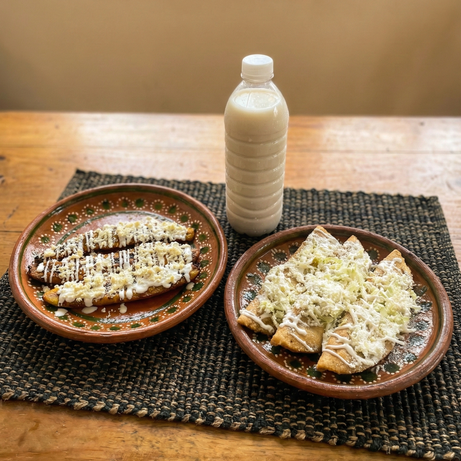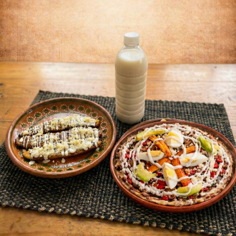 Agua Fresca Horchata o Jamaica*1 + Plátanos Fritos*1 + Memelas 1 Ingrediente*1
