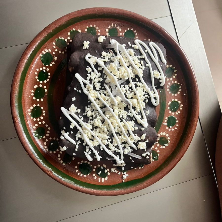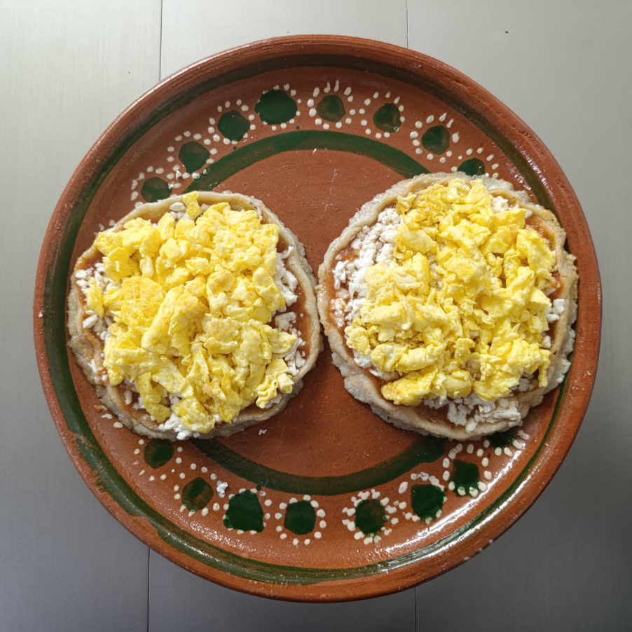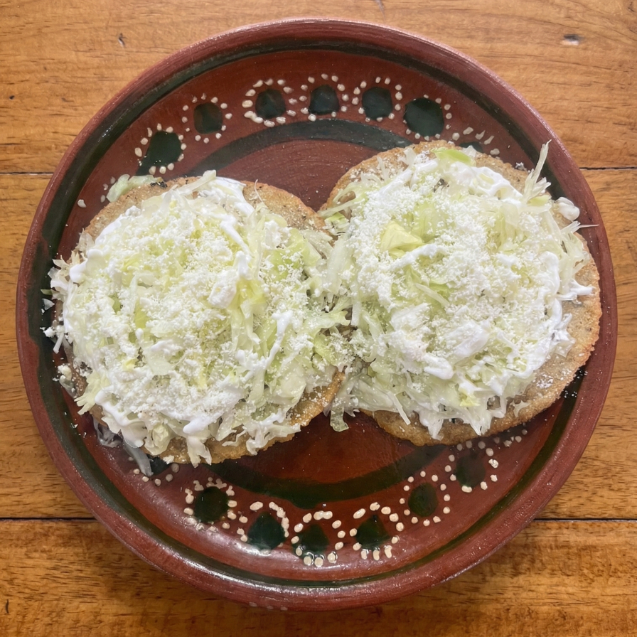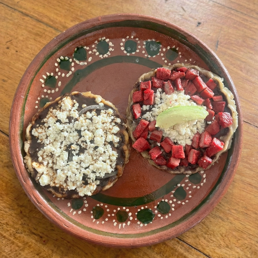 Queso fresco, cebolla salteada, nopales asados y frijoles refritos.