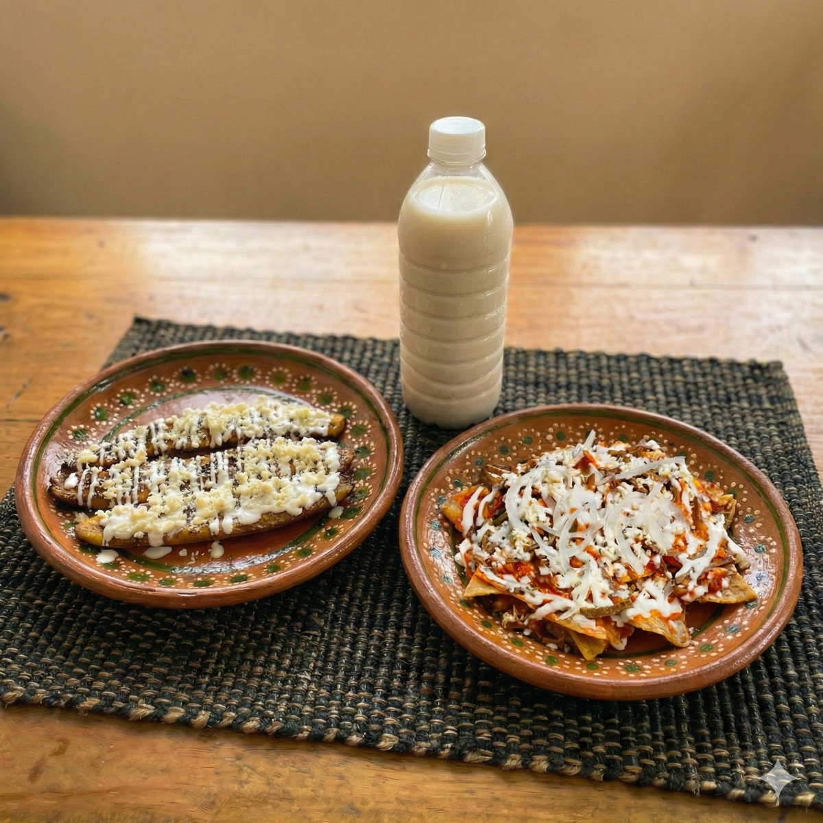 Plátanos Fritos*1 + Agua Fresca Horchata o Jamaica*1 + Chilaquiles*1