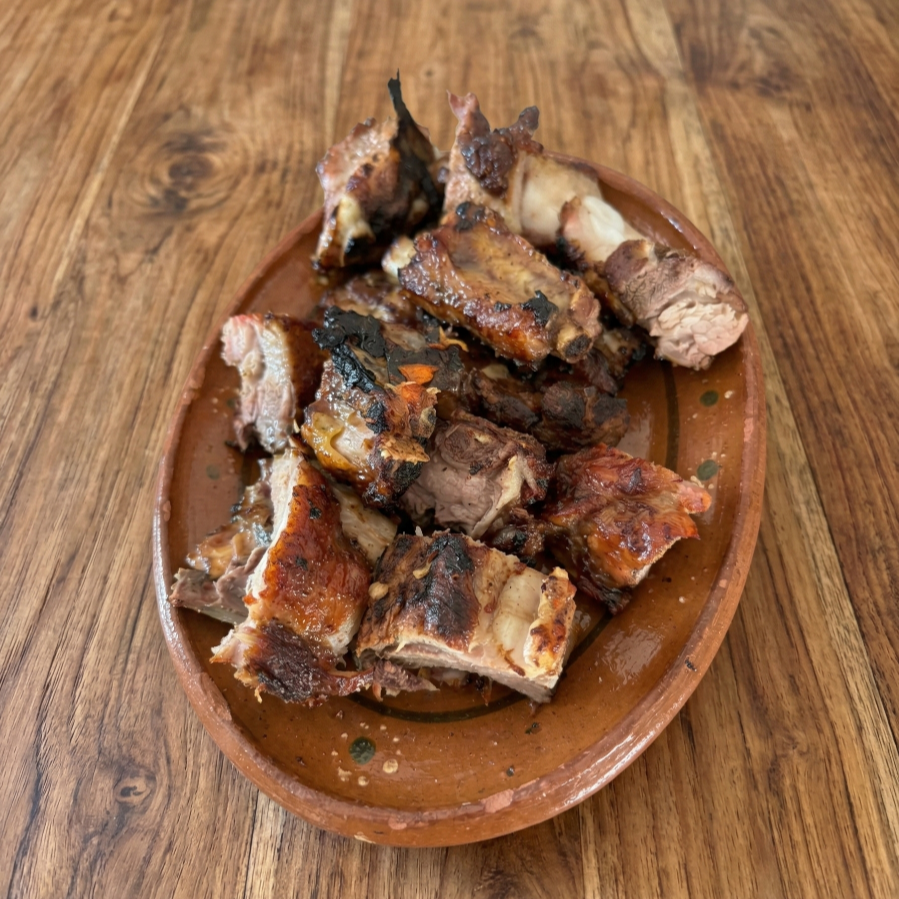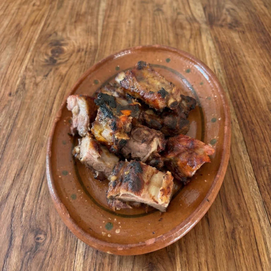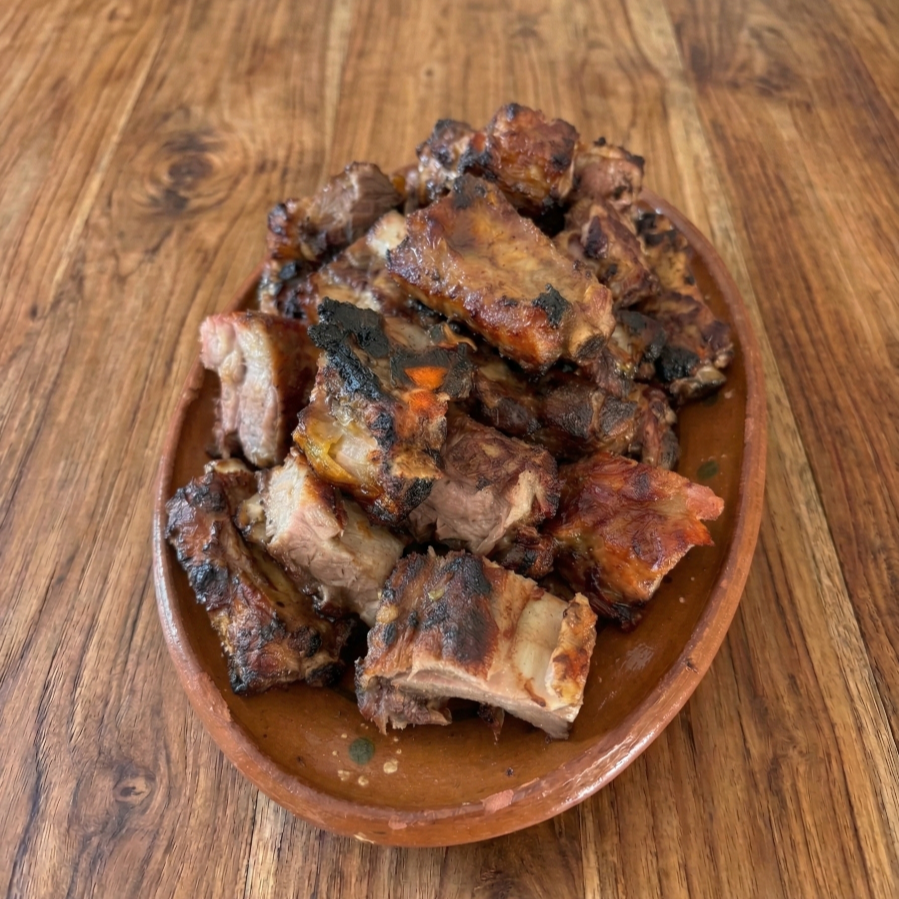 1 Kilo de costillas asadas al carbón, acompañadas de cebolla asada, chiles asados, salsa asada y cebolla morada.