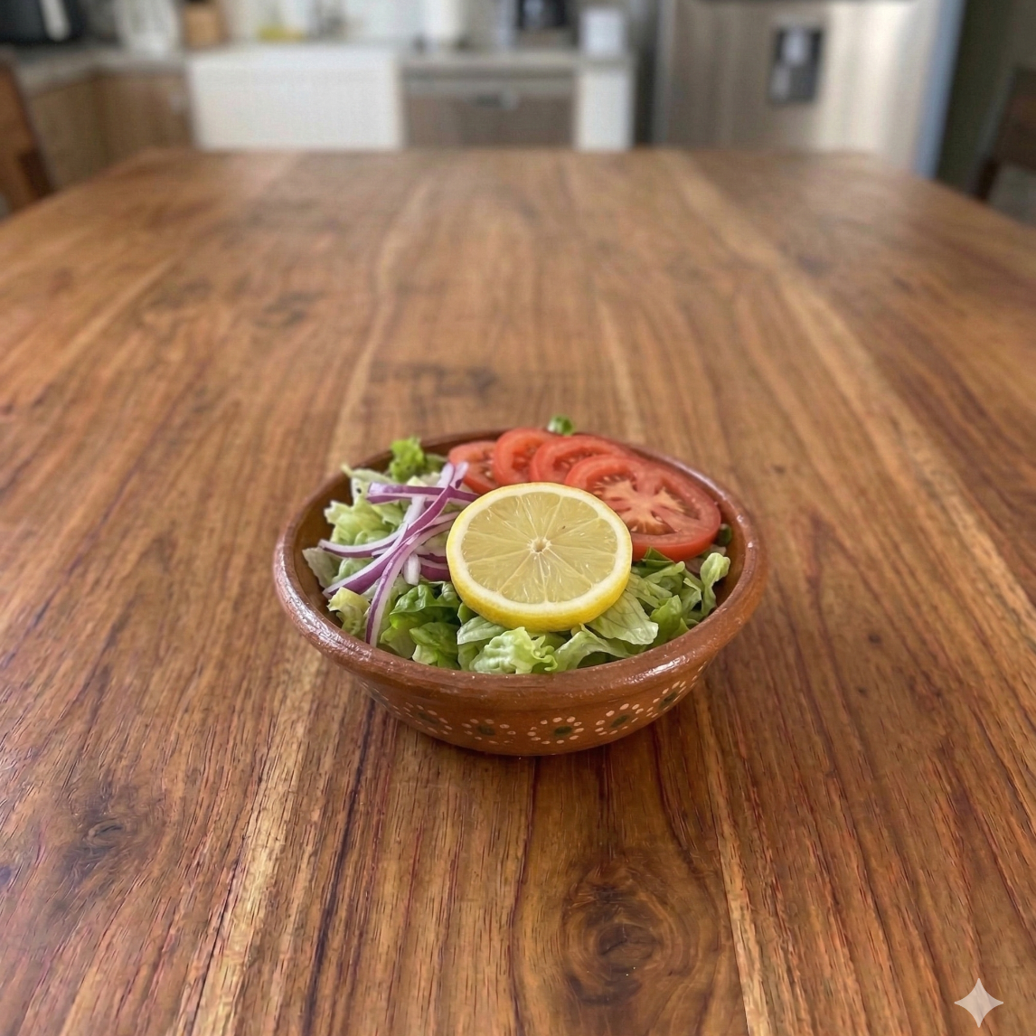 Lechuga, tomate, cebolla morada y una rodaja de limon.