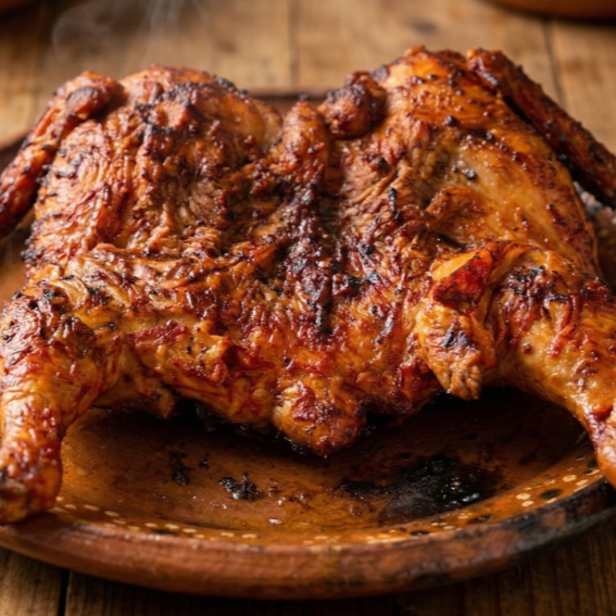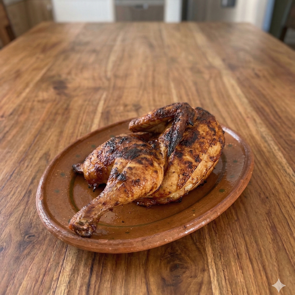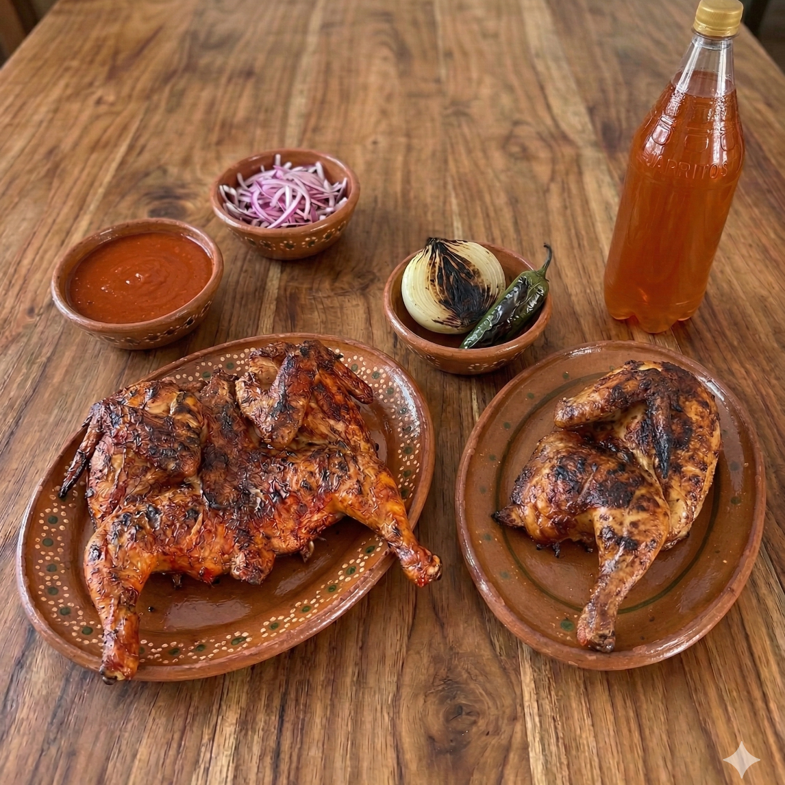 1 Pollo asado entero, 1/2 pollo asado, salsa asada, cebolla morada y refresco de 2 L (sabor disponible).