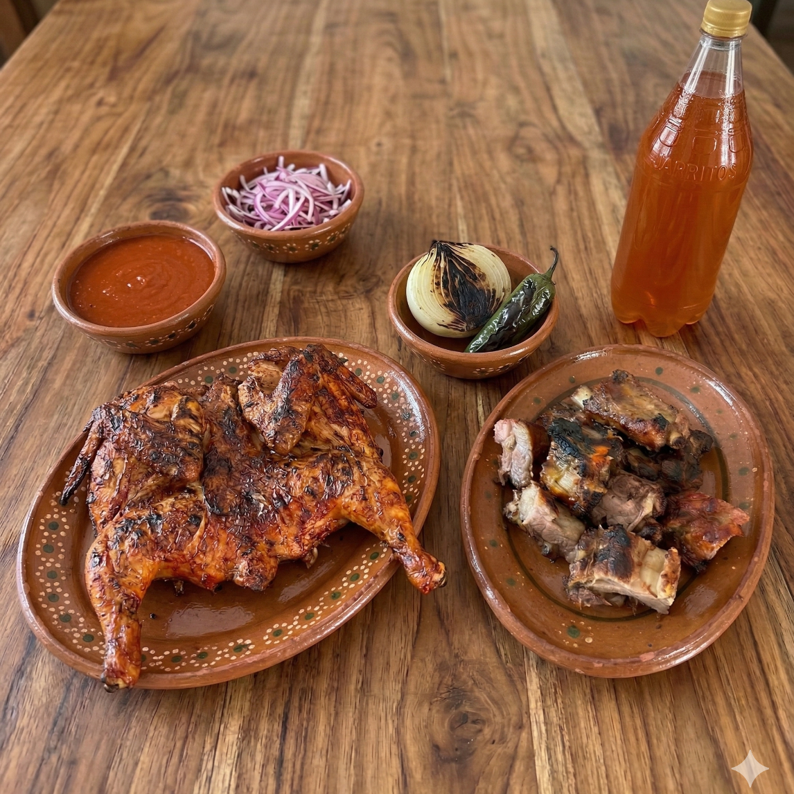 1 Pollo asado al carbón, 1/4 de costillas asadas, salsa asada, cebolla morada, chiles asados, cebolla asada y refresco de 2 L (sabor disponible).